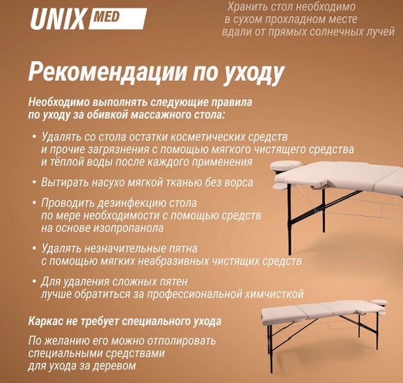 Складной трёхсекционный массажный стол UNIX Comfort 3 Section разработан для обеспечения максимального комфорта как специалиста, так и клиента посредством продуманной конструкции и использования качественных материалов. Стол обеспечивает максимум удобств как специалисту, проводящему процедуру, так и человеку, которому она предназначена. В спинке есть удобное анатомическое отверстие для лица.Деревянная кушетка для массажа выделяется невероятно прочной конструкцией, способной выдержать общую нагрузку до 250 кг (не перегружайте стол сверх рекомендованного предела веса). Благодаря своим компактным размерам он идеально впишется даже в самые небольшие помещения, будь то СПА-салон, домашний кабинет или офис. Возможность ручной регулировки высоты ножек от 60 до 81 см с шагом 3 см позволяет адаптировать стол под рост массажиста, обеспечивая наилучшую результативность сеансов массажа. Ложе толщиной 7 см обеспечит дополнительную поддержку и комфорт. Обивка стола выполнена из высококачественной эко-кожи, устойчивой к воздействию влаги, масел и кремов, что облегчает уход за ним и продлевает срок службы.Конструкция кушетки специально разработана таким образом, чтобы ее было удобно складывать и транспортировать. В сложенном состоянии стол превращается в компактный чемоданчик размерами 90 x 70 x 17 см, который легко переносить благодаря входящей в комплект сумке. Эта особенность делает стол особенно удобным для проведения выездных сеансов вне массажного кабинета. Стол удобно переносить, перевозить, в комплекте имеется сумка для хранения в сложенном виде. Сумка защитит стол и аксессуары от царапин и повреждений во время транспортировки.Ножная часть стола поднимается на 50 градусов (7 позиций), что позволяет клиентам занять самое удобное положение для проведения процедуры. Складной стол оборудован удобными подлокотниками 34х10 см, подвесной полкой для гаджетов 37,5х20 см и лямками с застежками-липучками.В комплектацию входят съёмные подлокотники, полка для гаджетов, подушка-валик и сумка для транспортировки. Всё это делает UNIX Comfort 3 Section Burgundy оптимальным выбором для массажистов, SPA-центров, студий тату, мастеров шугаринга, салонов красоты, а также для использования в домашних условиях. Этот деревянный массажный стол обеспечит высокий уровень эффективности и удобства проведения различных видов косметологических и оздоровительных процедур.Складной трёхсекционный массажный стол UNIX Comfort 3 Section разработан для обеспечения максимального комфорта как специалиста, так и клиента посредством продуманной конструкции и использования качественных материалов. Стол обеспечивает максимум удобств как специалисту, проводящему процедуру, так и человеку, которому она предназначена. В спинке есть удобное анатомическое отверстие для лица.Деревянная кушетка для массажа выделяется невероятно прочной конструкцией, способной выдержать общую нагрузку до 250 кг (не перегружайте стол сверх рекомендованного предела веса). Благодаря своим компактным размерам он идеально впишется даже в самые небольшие помещения, будь то СПА-салон, домашний кабинет или офис. Возможность ручной регулировки высоты ножек от 60 до 81 см с шагом 3 см позволяет адаптировать стол под рост массажиста, обеспечивая наилучшую результативность сеансов массажа. Ложе толщиной 7 см обеспечит дополни