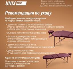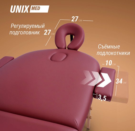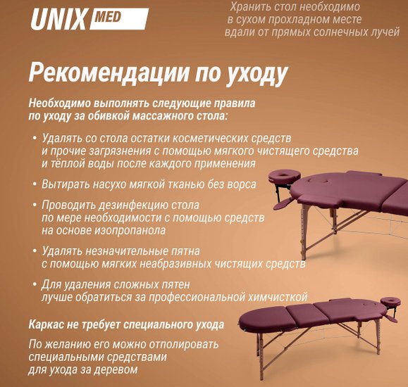 Складной трёхсекционный массажный стол UNIX Comfort 3 Section разработан для обеспечения максимального комфорта как специалиста, так и клиента посредством продуманной конструкции и использования качественных материалов. Стол обеспечивает максимум удобств как специалисту, проводящему процедуру, так и человеку, которому она предназначена. В спинке есть удобное анатомическое отверстие для лица.Деревянная кушетка для массажа выделяется невероятно прочной конструкцией, способной выдержать общую нагрузку до 250 кг (не перегружайте стол сверх рекомендованного предела веса). Благодаря своим компактным размерам он идеально впишется даже в самые небольшие помещения, будь то СПА-салон, домашний кабинет или офис. Возможность ручной регулировки высоты ножек от 60 до 81 см с шагом 3 см позволяет адаптировать стол под рост массажиста, обеспечивая наилучшую результативность сеансов массажа. Ложе толщиной 7 см обеспечит дополнительную поддержку и комфорт. Обивка стола выполнена из высококачественной эко-кожи, устойчивой к воздействию влаги, масел и кремов, что облегчает уход за ним и продлевает срок службы.Конструкция кушетки специально разработана таким образом, чтобы ее было удобно складывать и транспортировать. В сложенном состоянии стол превращается в компактный чемоданчик размерами 90 x 70 x 17 см, который легко переносить благодаря входящей в комплект сумке. Эта особенность делает стол особенно удобным для проведения выездных сеансов вне массажного кабинета. Стол удобно переносить, перевозить, в комплекте имеется сумка для хранения в сложенном виде. Сумка защитит стол и аксессуары от царапин и повреждений во время транспортировки.Ножная часть стола поднимается на 50 градусов (7 позиций), что позволяет клиентам занять самое удобное положение для проведения процедуры. Складной стол оборудован удобными подлокотниками 34х10 см, подвесной полкой для гаджетов 37,5х20 см и лямками с застежками-липучками.В комплектацию входят съёмные подлокотники, полка для гаджетов, подушка-валик и сумка для транспортировки. Всё это делает UNIX Comfort 3 Section Burgundy оптимальным выбором для массажистов, SPA-центров, студий тату, мастеров шугаринга, салонов красоты, а также для использования в домашних условиях. Этот деревянный массажный стол обеспечит высокий уровень эффективности и удобства проведения различных видов косметологических и оздоровительных процедур.Складной трёхсекционный массажный стол UNIX Comfort 3 Section разработан для обеспечения максимального комфорта как специалиста, так и клиента посредством продуманной конструкции и использования качественных материалов. Стол обеспечивает максимум удобств как специалисту, проводящему процедуру, так и человеку, которому она предназначена. В спинке есть удобное анатомическое отверстие для лица.Деревянная кушетка для массажа выделяется невероятно прочной конструкцией, способной выдержать общую нагрузку до 250 кг (не перегружайте стол сверх рекомендованного предела веса). Благодаря своим компактным размерам он идеально впишется даже в самые небольшие помещения, будь то СПА-салон, домашний кабинет или офис. Возможность ручной регулировки высоты ножек от 60 до 81 см с шагом 3 см позволяет адаптировать стол под рост массажиста, обеспечивая наилучшую результативность сеансов массажа. Ложе толщиной 7 см обеспечит дополни
