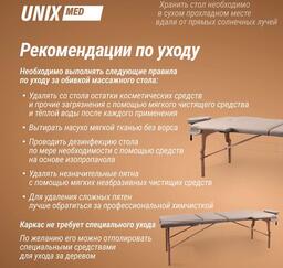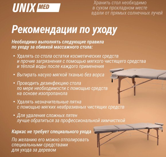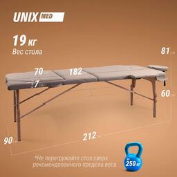 Массажный стол UNIX Standard 3 Section сочетает в себе высокую функциональность, исключительный комфорт и стильный дизайн. Этот трехсекционный стол для массажа и косметологических процедур подойдет как для профессиональных массажистов и мастеров, так и для тех, кто любит делать массаж самостоятельно. Стол обеспечивает максимум удобств как специалисту, проводящему процедуру, так и человеку, которому она предназначена. Продуманная конструкция модели обеспечит максимальный комфорт клиенту во время массажа спины, шеи и ног. В спинке есть удобное анатомическое отверстие для лица.Деревянная кушетка для массажа выделяется невероятно прочной конструкцией, способной выдержать общую нагрузку до 250 кг (не перегружайте стол сверх рекомендованного предела веса). Благодаря своим компактным размерам он идеально впишется даже в самые небольшие помещения, будь то СПА-салон, домашний кабинет или офис. Возможность ручной регулировки высоты ножек от 60 до 81 см с шагом 3 см позволяет адаптировать стол под рост массажиста, обеспечивая наилучшую результативность сеансов массажа. Ложе толщиной 6 см обеспечит дополнительную поддержку и комфорт. Для еще большего удобства массажного стола в комплекте предусмотрены регулируемый по наклону и высоте подголовник и подставка для гаджетов, расположенная у изголовья, а также боковые подлокотники. Конструкция складной кушетки специально разработана таким образом, чтобы ее было удобно складывать и транспортировать. В сложенном состоянии стол превращается в компактный чемоданчик размерами 90 x 70 x 17 см, который легко переносить благодаря входящей в комплект сумке. Эта особенность делает стол особенно удобным для проведения выездных сеансов вне массажного кабинета. Стол удобно переносить, перевозить, в комплекте имеется сумка для хранения в сложенном виде. Сумка защитит стол и аксессуары от царапин и повреждений во время транспортировки.Подголовник обладает возможностью регулировки по высоте и наклону, обеспечивая идеальную поддержку головы и шеи. Ножная часть стола поднимается на 50 градусов (7 позиций), что позволяет клиентам занять самое удобное положение для проведения процедуры. Складной стол оборудован удобными подлокотниками 34х10 см, подвесной полкой для гаджетов 37,5х20 см и лямками с застежками-липучками.Основу каркаса и ножек составляют натуральные материалы — древесина твердых пород, покрытая безопасным лаком, что делает кушетку не только надежным, но и экологически безопасным продуктом. Усиленные ножки придают регулируемой кушетке дополнительную устойчивость, а тросы из авиационного алюминия обеспечивают надежность и долговечность. Обивка стола выполнена из высококачественной эко-кожи, устойчивой к воздействию влаги, масел и кремов, что облегчает уход за ним и продлевает срок службы.Кушетка UNIX Standard 3 Section подходит для выполнения множества различных процедур: SPA-процедуры, косметологические услуги, работа в тату – салоне, массажном салоне и салоне красоты. Универсальность стола делает его отличным выбором для самого широкого круга пользователей.Уход за столом прост и удобен. Обивку можно ежедневно чистить мягким моющим средством и теплой водой, после чего протирать сухой тряпочкой без ворса. Каркас стола не нуждается в особом уходе. Массажный стол UNIX Standard 3 Section — это идеальный выбор для т