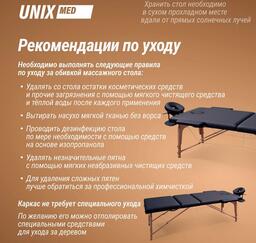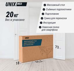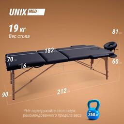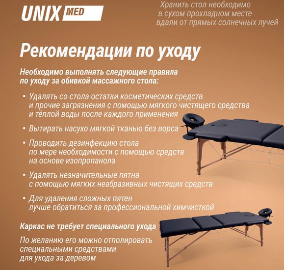 Массажный стол UNIX Standard 3 Section сочетает в себе высокую функциональность, исключительный комфорт и стильный дизайн. Этот трехсекционный стол для массажа и косметологических процедур подойдет как для профессиональных массажистов и мастеров, так и для тех, кто любит делать массаж самостоятельно. Стол обеспечивает максимум удобств как специалисту, проводящему процедуру, так и человеку, которому она предназначена. Продуманная конструкция модели обеспечит максимальный комфорт клиенту во время массажа спины, шеи и ног. В спинке есть удобное анатомическое отверстие для лица.Деревянная кушетка для массажа выделяется невероятно прочной конструкцией, способной выдержать общую нагрузку до 250 кг (не перегружайте стол сверх рекомендованного предела веса). Благодаря своим компактным размерам он идеально впишется даже в самые небольшие помещения, будь то СПА-салон, домашний кабинет или офис. Возможность ручной регулировки высоты ножек от 60 до 81 см с шагом 3 см позволяет адаптировать стол под рост массажиста, обеспечивая наилучшую результативность сеансов массажа. Ложе толщиной 6 см обеспечит дополнительную поддержку и комфорт. Для еще большего удобства массажного стола в комплекте предусмотрены регулируемый по наклону и высоте подголовник и подставка для гаджетов, расположенная у изголовья, а также боковые подлокотники. Конструкция складной кушетки специально разработана таким образом, чтобы ее было удобно складывать и транспортировать. В сложенном состоянии стол превращается в компактный чемоданчик размерами 90 x 70 x 17 см, который легко переносить благодаря входящей в комплект сумке. Эта особенность делает стол особенно удобным для проведения выездных сеансов вне массажного кабинета. Стол удобно переносить, перевозить, в комплекте имеется сумка для хранения в сложенном виде. Сумка защитит стол и аксессуары от царапин и повреждений во время транспортировки.Подголовник обладает возможностью регулировки по высоте и наклону, обеспечивая идеальную поддержку головы и шеи. Ножная часть стола поднимается на 50 градусов (7 позиций), что позволяет клиентам занять самое удобное положение для проведения процедуры. Складной стол оборудован удобными подлокотниками 34х10 см, подвесной полкой для гаджетов 37,5х20 см и лямками с застежками-липучками.Основу каркаса и ножек составляют натуральные материалы — древесина твердых пород, покрытая безопасным лаком, что делает кушетку не только надежным, но и экологически безопасным продуктом. Усиленные ножки придают регулируемой кушетке дополнительную устойчивость, а тросы из авиационного алюминия обеспечивают надежность и долговечность. Обивка стола выполнена из высококачественной эко-кожи, устойчивой к воздействию влаги, масел и кремов, что облегчает уход за ним и продлевает срок службы.Кушетка UNIX Standard 3 Section подходит для выполнения множества различных процедур: SPA-процедуры, косметологические услуги, работа в тату – салоне, массажном салоне и салоне красоты. Универсальность стола делает его отличным выбором для самого широкого круга пользователей.Уход за столом прост и удобен. Обивку можно ежедневно чистить мягким моющим средством и теплой водой, после чего протирать сухой тряпочкой без ворса. Каркас стола не нуждается в особом уходе. Массажный стол UNIX Standard 3 Section — это идеальный выбор для т
