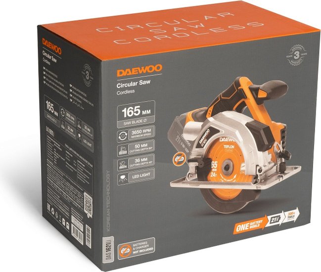✅Ключевые характеристикиАккумуляторная дисковая пила предназначена для точного и чистого распила древесины и других материалов на глубину до 50 мм при прямом резе и до 36 мм под углом 45°. Благодаря питанию от 21В Li-Ion аккумулятора данный инструмент обеспечивает мобильность и независимость от электросети, что востребовано на строительных и ремонтных площадках.✅Преимущества и отличияМодель оснащена алюминиевой подошвой для устойчивости и точности реза, а специальный тефлоновый диск диаметром 165 мм снижает трение и увеличивает износостойкость. LED-подсветка улучшает видимость в условиях слабого освещения, а адаптер для пылеотвода позволяет сохранять рабочее место чистым.✅ПрактичностьИнструмент совместим с единой платформой аккумуляторов 21В DAEWOO, что позволяет использовать одну батарею для разных устройств бренда. Регулировка глубины и угла пропила осуществляется быстро и просто, а прорезиненная рукоятка снижает скольжение и повышает комфорт при длительной работе.✅УникальностьМодель выделяется возможностью подключения к пылесосу для удаления опилок, наличием параллельной направляющей для прямолинейного реза и бесступенчатой регулировкой наклона. Комплектация включает пильный диск с низким уровнем шума и высококачественным резом, что делает инструмент оптимальным выбором для профессиональных и бытовых задач.✅Ключевые характеристикиАккумуляторная дисковая пила предназначена для точного и чистого распила древесины и других материалов на глубину до 50 мм при прямом резе и до 36 мм под углом 45°. Благодаря питанию от 21В Li-Ion аккумулятора данный инструмент обеспечивает мобильность и независимость от электросети, что востребовано на строительных и ремонтных площадках.✅Преимущества и отличияМодель оснащена алюминиевой подошвой для устойчивости и точности реза, а специальный тефлоновый диск диаметром 165 мм снижает трение и увеличивает износостойкость. LED-подсветка улучшает видимость в условиях слабого освещения, а адаптер для пылеотвода позволяет сохранять рабочее место чистым.✅ПрактичностьИнструмент совместим с единой платформой аккумуляторов 21В DAEWOO, что позволяет использовать одну батарею для разных устройств бренда. Регулировка глубины и угла пропила осуществляется быстро и просто, а прорезиненная рукоятка снижает скольжение и повышает комфорт при длительной работе.✅УникальностьМодель выделяется возможностью подключения к пылесосу для удаления опилок, наличием параллельной направляющей для прямолинейного реза и бесступенчатой регулировкой наклона. Комплектация включает пильный диск с низким уровнем шума и высококачественным резом, что делает инструмент оптимальным выбором для профессиональных и бытовых задач.