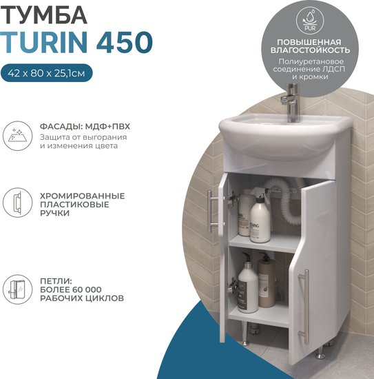 ✅ Тумба под раковину Turin 450-2-0 (Уют) — это идеальное решение для вашей ванной комнаты. Она сочетает в себе стильный дизайн и функциональность, что делает её незаменимым элементом интерьера. Благодаря компактным размерам, тумба отлично впишется даже в небольшие пространства, обеспечивая при этом достаточное место для хранения необходимых принадлежностей.✅ Изготовленная из влагостойкой ЛДСП, тумба Turin гарантирует долговечность и устойчивость к воздействию влаги. Гладкая поверхность с глянцевым покрытием не только придаёт изделию современный вид, но и облегчает уход за ним. Вы сможете легко поддерживать чистоту, что особенно важно в условиях ванной комнаты.✅ Удобная конструкция с двумя дверцами и одной полкой позволяет организовать пространство так, чтобы все нужные вещи были под рукой. Регулируемые опоры обеспечивают стабильность и позволяют адаптировать тумбу под любые условия. Это делает её отличным выбором для тех, кто ценит комфорт и практичность.⚠️ Обратите внимание, что тумба поставляется в разобранном виде, что позволяет легко транспортировать её и собирать самостоятельно. Это отличный вариант для тех, кто предпочитает заниматься обустройством своего дома своими руками.✅ Тумба под раковину Turin 450-2-0 (Уют) станет не только функциональным, но и стильным акцентом в вашей ванной комнате. Создайте уютное пространство, где будет приятно проводить время!✅ Тумба под раковину Turin 450-2-0 (Уют) — это идеальное решение для вашей ванной комнаты. Она сочетает в себе стильный дизайн и функциональность, что делает её незаменимым элементом интерьера. Благодаря компактным размерам, тумба отлично впишется даже в небольшие пространства, обеспечивая при этом достаточное место для хранения необходимых принадлежностей.✅ Изготовленная из влагостойкой ЛДСП, тумба Turin гарантирует долговечность и устойчивость к воздействию влаги. Гладкая поверхность с глянцевым покрытием не только придаёт изделию современный вид, но и облегчает уход за ним. Вы сможете легко поддерживать чистоту, что особенно важно в условиях ванной комнаты.✅ Удобная конструкция с двумя дверцами и одной полкой позволяет организовать пространство так, чтобы все нужные вещи были под рукой. Регулируемые опоры обеспечивают стабильность и позволяют адаптировать тумбу под любые условия. Это делает её отличным выбором для тех, кто ценит комфорт и практичность.⚠️ Обратите внимание, что тумба поставляется в разобранном виде, что позволяет легко транспортировать её и собирать самостоятельно. Это отличный вариант для тех, кто предпочитает заниматься обустройством своего дома своими руками.✅ Тумба под раковину Turin 450-2-0 (Уют) станет не только функциональным, но и стильным акцентом в вашей ванной комнате. Создайте уютное пространство, где будет приятно проводить время!