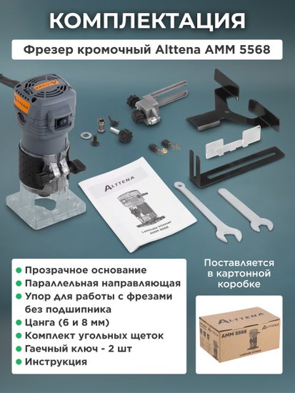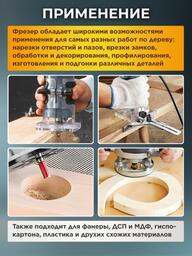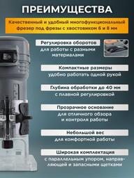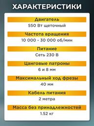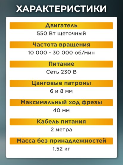 ✅Ключевые характеристикиКромочный фрезер предназначен для точной обработки дерева, включая прорезание пазов, снятие фасок и профилирование. Мощность 550 Вт обеспечивает эффективную работу по древесине, а глубина погружения до 40 мм позволяет выполнять широкий спектр задач в столярных и ремонтных работах. Инструмент работает от сети 220 В и оснащён цангами на 6 и 8 мм.✅Преимущества и отличияМодель отличается компактными размерами и малым весом 1.52 кг, что обеспечивает удобство при длительном использовании одной рукой. Благодаря плавной регулировке глубины и диапазону оборотов 10000-30000 об/мин пользователь может легко подобрать оптимальные параметры для разных операций. Эргономичный корпус исключает усталость при работе.✅ПрактичностьДля повышения точности фрезерования предусмотрен параллельный упор и возможность регулировки оборотов, что особенно важно при работе с разными породами древесины. Щеточный электродвигатель и комплект запасных угольных щёток обеспечивают простоту обслуживания. Длина сетевого шнура 2 м дает свободу передвижения при работе.✅УникальностьК особенностям можно отнести высокий уровень безопасности и контроля при работе за счет качественной сборки и наличия упора для фрез без подшипника. Инструмент рассчитан на бытовое использование, а 24-месячная гарантия и сертификация подтверждают его надежность.✅Ключевые характеристикиКромочный фрезер предназначен для точной обработки дерева, включая прорезание пазов, снятие фасок и профилирование. Мощность 550 Вт обеспечивает эффективную работу по древесине, а глубина погружения до 40 мм позволяет выполнять широкий спектр задач в столярных и ремонтных работах. Инструмент работает от сети 220 В и оснащён цангами на 6 и 8 мм.✅Преимущества и отличияМодель отличается компактными размерами и малым весом 1.52 кг, что обеспечивает удобство при длительном использовании одной рукой. Благодаря плавной регулировке глубины и диапазону оборотов 10000-30000 об/мин пользователь может легко подобрать оптимальные параметры для разных операций. Эргономичный корпус исключает усталость при работе.✅ПрактичностьДля повышения точности фрезерования предусмотрен параллельный упор и возможность регулировки оборотов, что особенно важно при работе с разными породами древесины. Щеточный электродвигатель и комплект запасных угольных щёток обеспечивают простоту обслуживания. Длина сетевого шнура 2 м дает свободу передвижения при работе.✅УникальностьК особенностям можно отнести высокий уровень безопасности и контроля при работе за счет качественной сборки и наличия упора для фрез без подшипника. Инструмент рассчитан на бытовое использование, а 24-месячная гарантия и сертификация подтверждают его надежность.