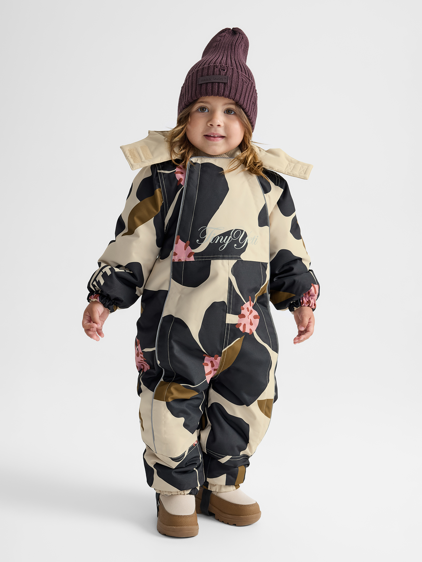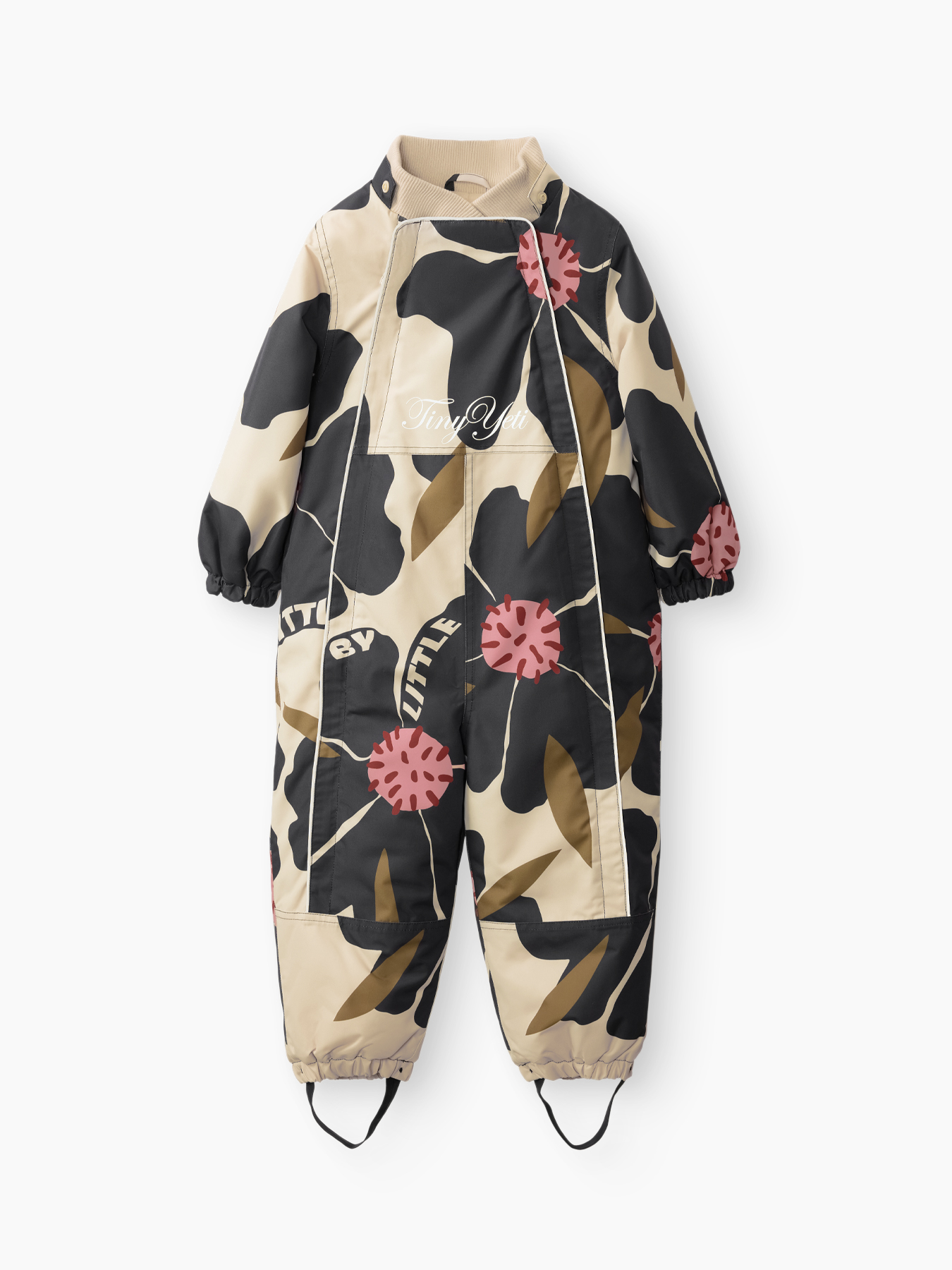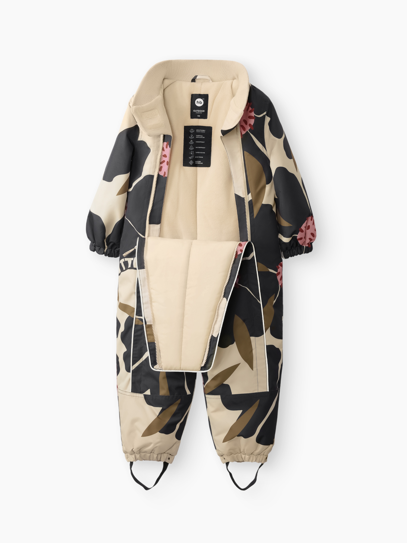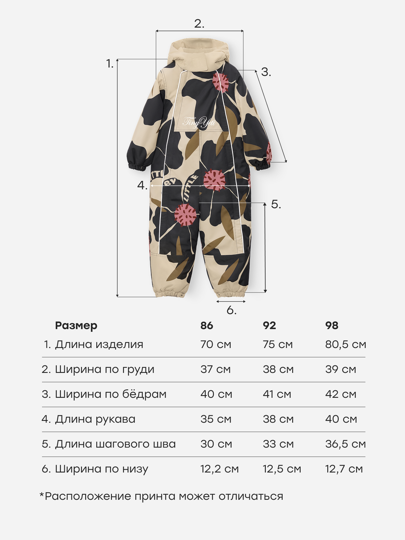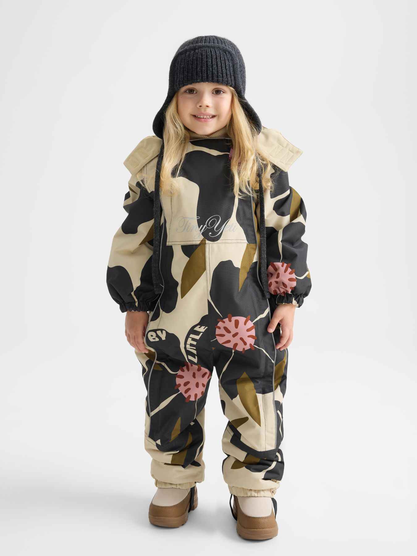 Рукава и штанины дополнены резинками, плотно прилегающими к телу малыша для предотвращения попадания снега внутрь. Материал верха устойчив к загрязнениям и легко очищается, что делает этот зимний костюм практичным выбором как для мальчиков, так и для девочек.