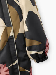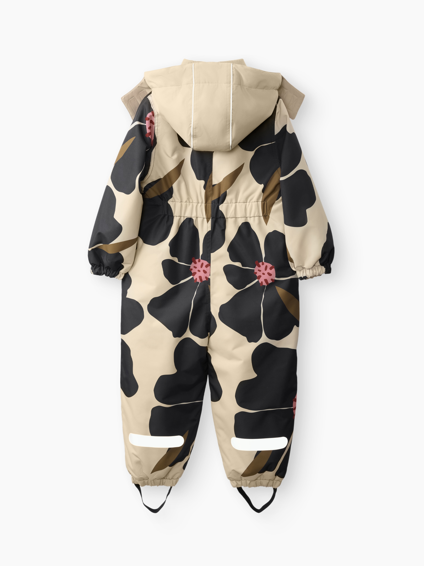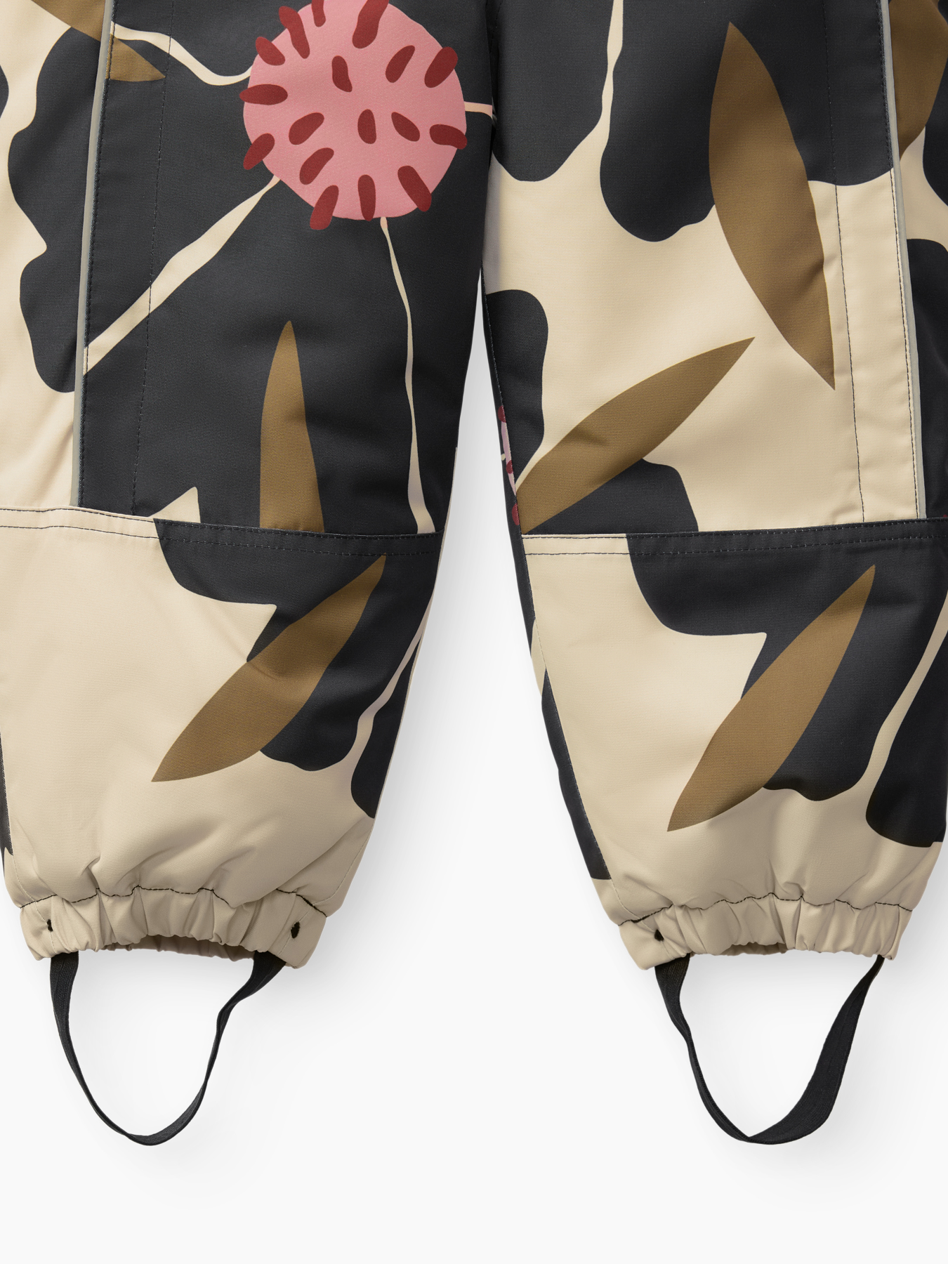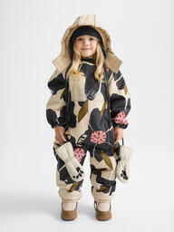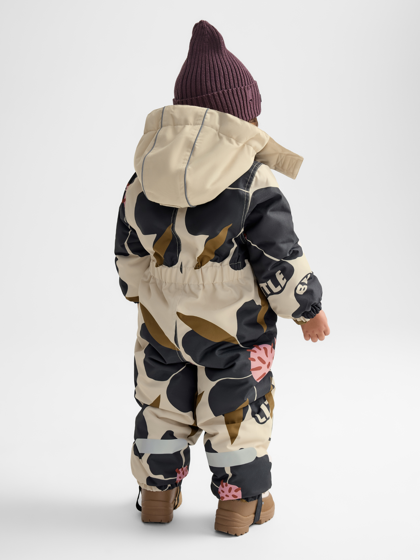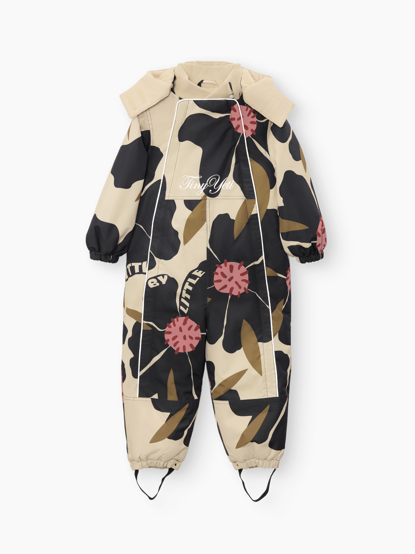 Рукава и штанины дополнены резинками, плотно прилегающими к телу малыша для предотвращения попадания снега внутрь. Материал верха устойчив к загрязнениям и легко очищается, что делает этот зимний костюм практичным выбором как для мальчиков, так и для девочек.