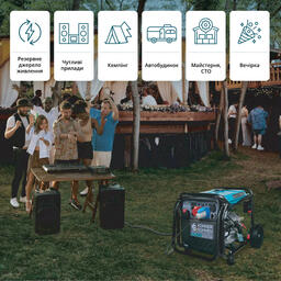 Предусматривает контроль за основными параметрами: режим работы, перегрузка, низкий уровень масла. В наличии кнопка сброса, USB-порты, выход 12В и розетки 230В и 380В.