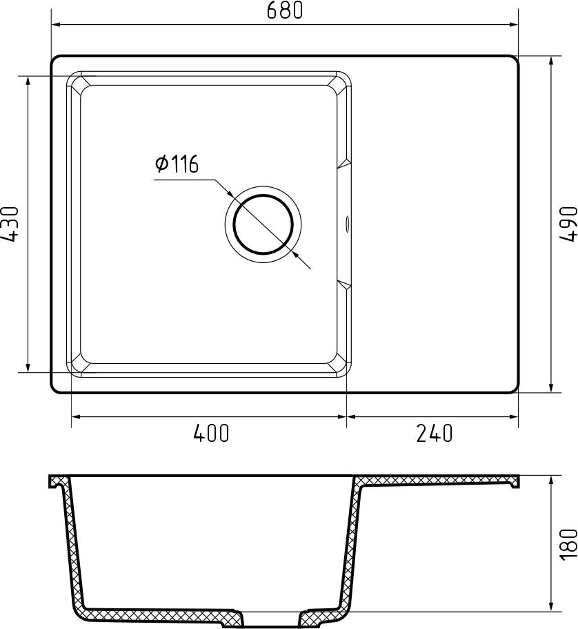 Размеры мойки (ДхШ): 68х49 см