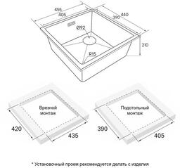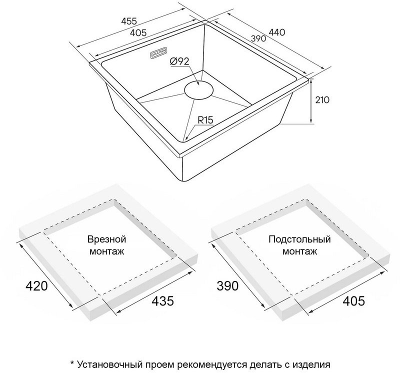 Размер мойки 45,5 x 44 см