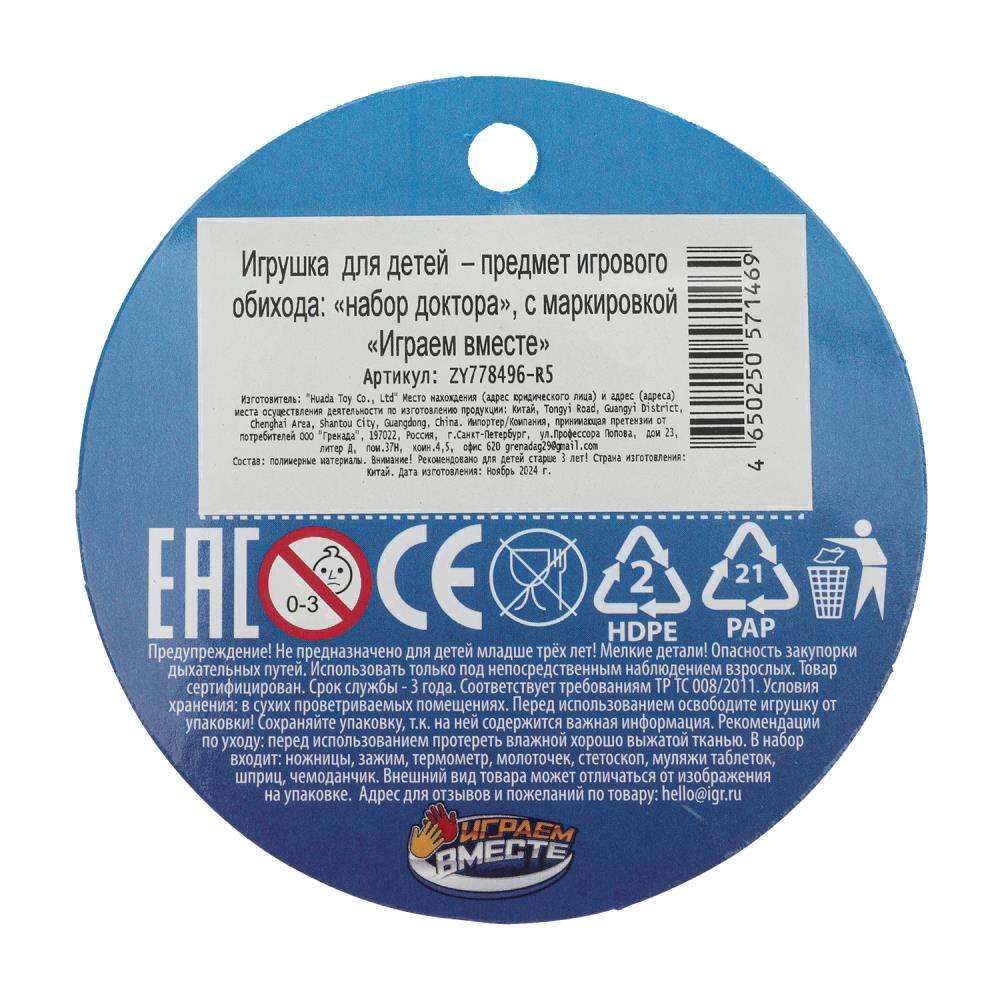 • Инструмент в наборе стетоскоп, шприц, градусник, молоточек, ножницы, зажим