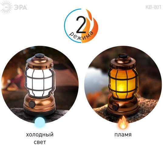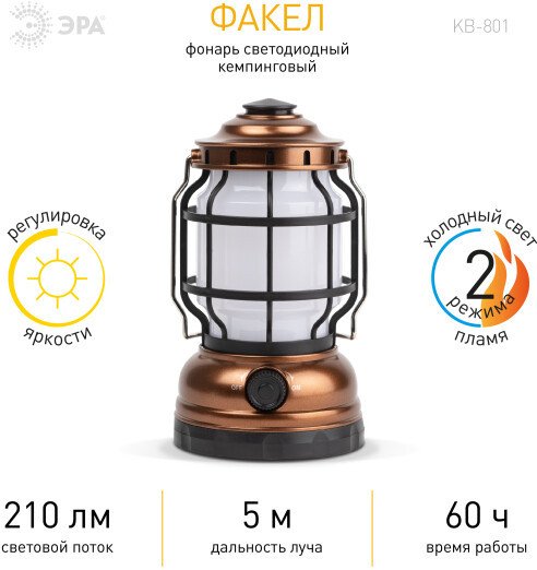 - ЭРА КВ-801 «Факел» - светодиодный кемпинговый фонарь в ретро-стиле. Светит в 2 режимах – холодный белый свет и режим теплого пламени. Работает от 3 пальчиковых батареек (3 х АА). Одного комплекта алкалиновых элементов питания хватает на 60 часов непрерывного свечения.Удобный диммер на корпусе позволяет регулировать яркость. Благодаря 39 светодиодам нового поколения этот красивый фонарь освещает пространство на 5 метров вокруг. Световой поток – 210 Лм. Отличный походный светильник-фонарь для дороги или привала! Имеется ручка для переноса или подвеса.Батареечный LED-фонарь ЭРА «Факел» изготовлен из легкого ударопрочного пластика и имеет надежное устойчивое основание. ЭРА КВ-801 «Факел» - светодиодный кемпинговый фонарь в ретро-стиле. Светит в 2 режимах – холодный белый свет и режим теплого пламени. Работает от 3 пальчиковых батареек (3 х АА). Одного комплекта алкалиновых элементов питания хватает на 60 часов непрерывного свечения.Удобный диммер на корпусе позволяет регулировать яркость. Благодаря 39 светодиодам нового поколения этот красивый фонарь освещает пространство на 5 метров вокруг. Световой поток – 210 Лм. Отличный походный светильник-фонарь для дороги или привала! Имеется ручка для переноса или подвеса.Батареечный LED-фонарь ЭРА «Факел» изготовлен из легкого ударопрочного пластика и имеет надежное устойчивое основание.