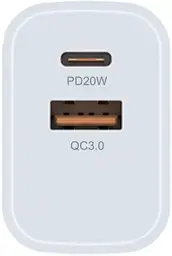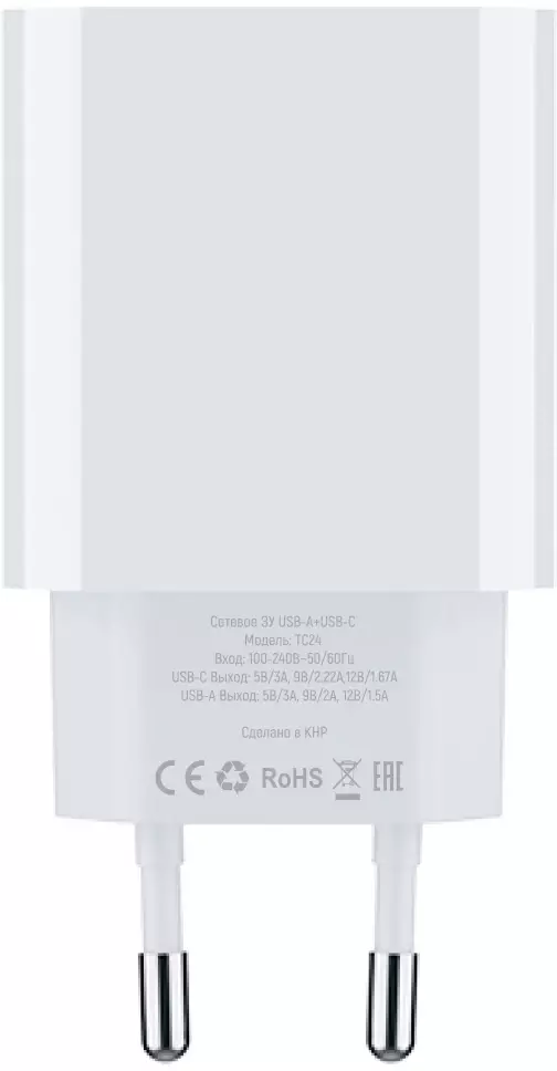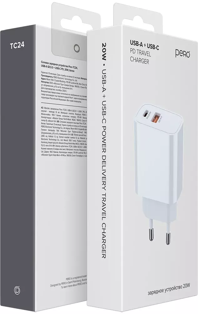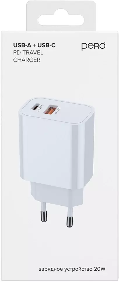 ОписаниеСетевое зарядное устройство PERO TC24 оснащено 2-мя USB-портами — USB-А с выходным током до 3А и USB-C с функцией быстрой зарядки Power Delivery, мощностью 20W. СЗУ имеет функцию fast charge и защиту от перегрузок и перегрева. Входное напряжение: 110-240В, 50-60Гц. LED-подсветка. Цвет: белый.