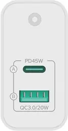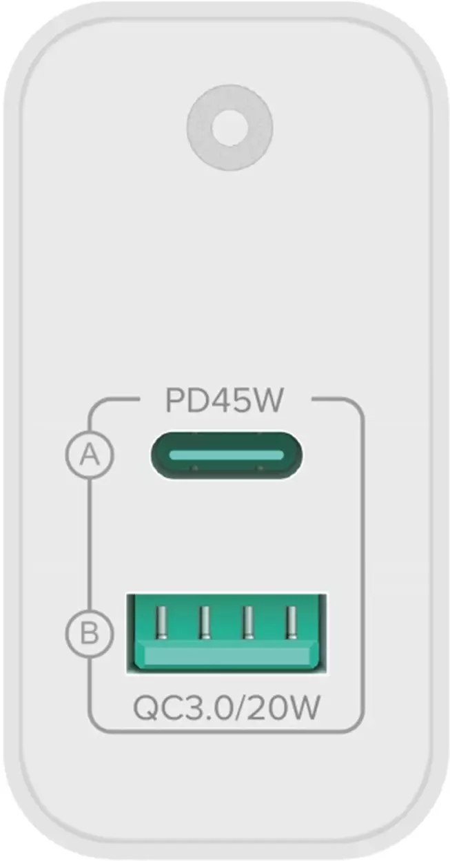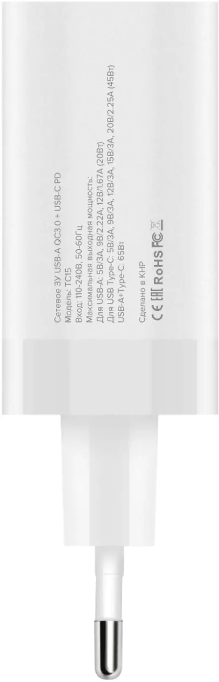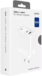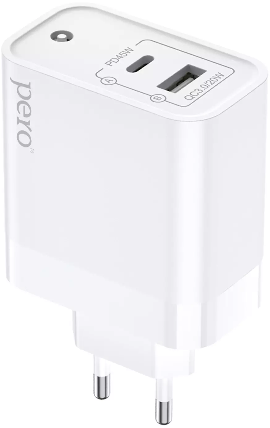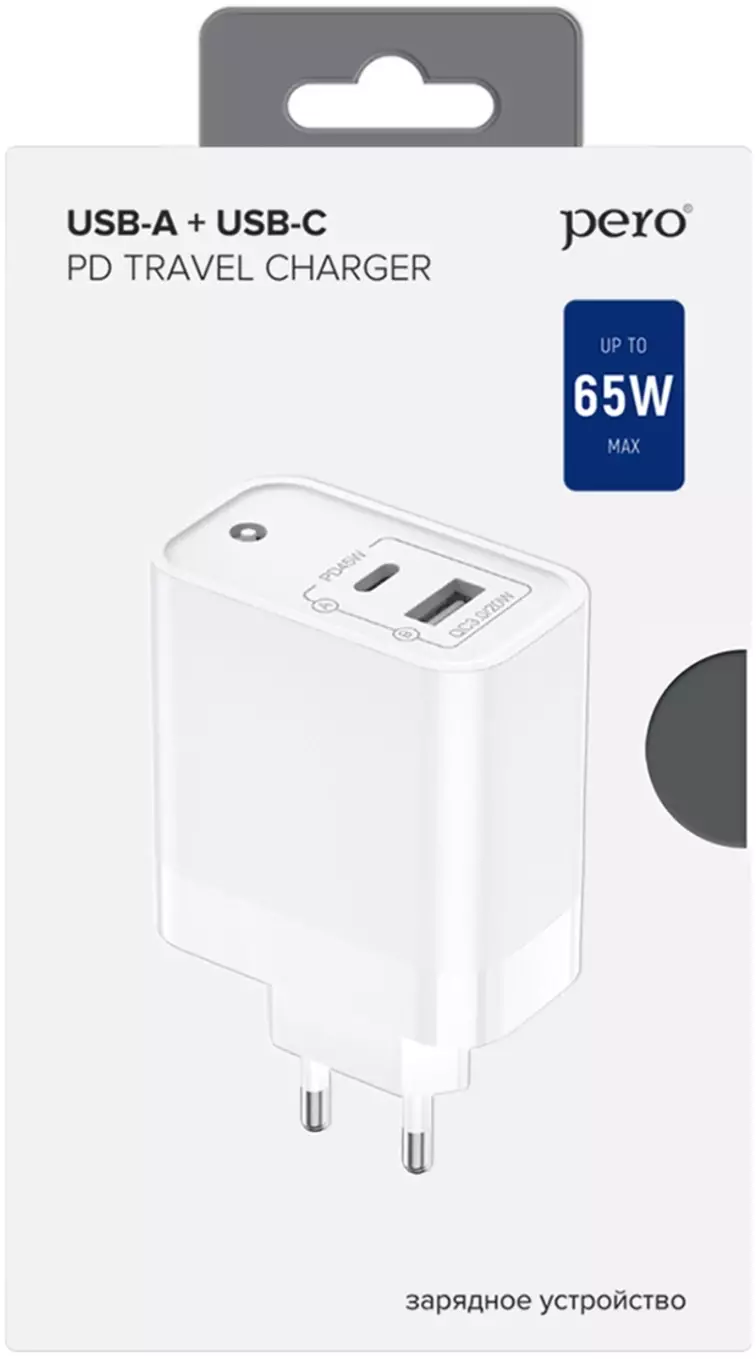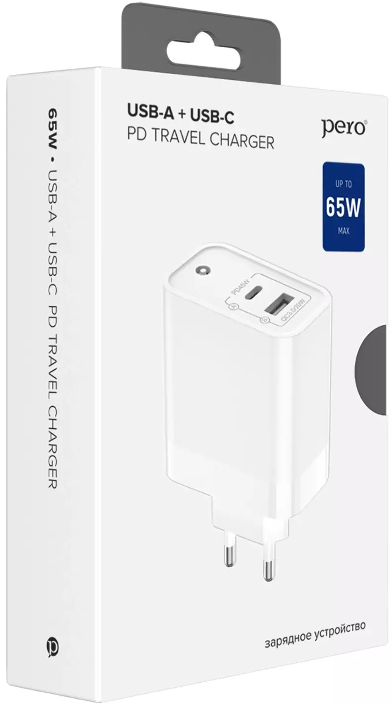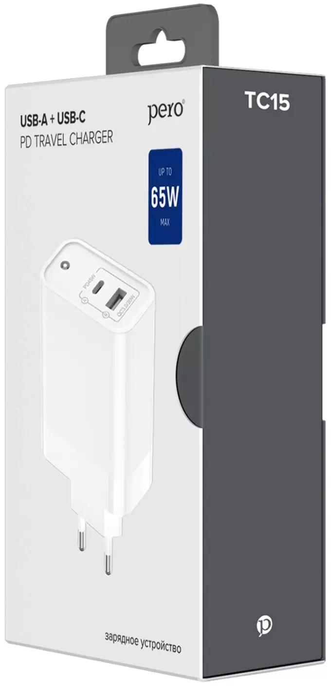 ОписаниеСетевое зарядное устройство PERO TC15 оснащено 2-мя USB-портами - USB-А с мощностью 20Вт и максимальной силой тока до 3А и портом USB Type-C с функцией быстрой зарядки Power Delivery, максимальной мощностью 45Вт и силой тока до 3А. Суммарная мощность обоих портов составляет 65Вт.