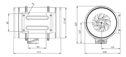 - Ширина/диаметр вентилятора/воздуховода 208 мм