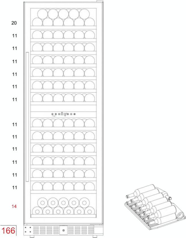 Электронное управление помогает быстро разобраться в том, как функционирует эта модель, и легко настроить все необходимые параметры. На дисплее отображаются данные, которые собирают датчики в камере. Лампочки, расположенные внутри, хорошо подсвечивают бутылки. Всего полок, на которых можно разместить коллекцию, в шкафу 14 шт. Пространство тщательно вентилируется, чтобы воздух не застаивался, не попадали посторонние запахи.