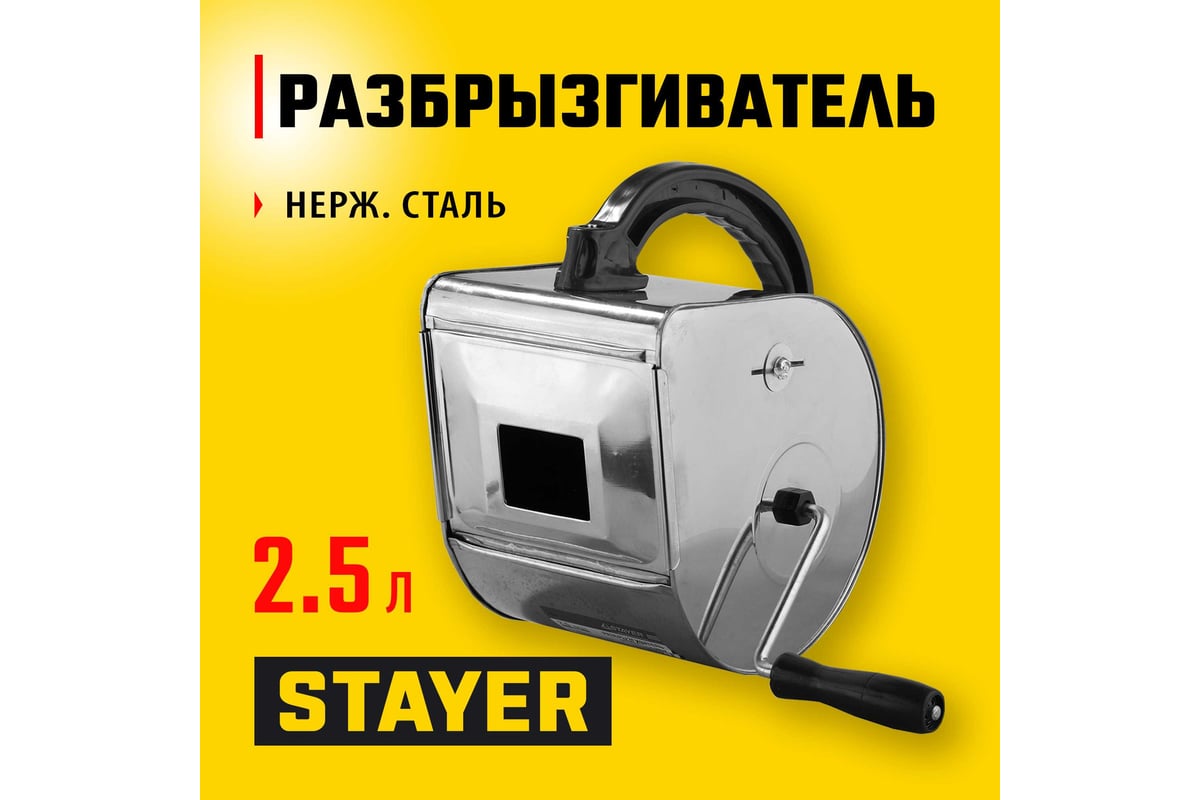 Разбрызгиватель для строительных смесей 2.5 STAYER ПРОФИ 08270 оснащен удобной рукояткой, что облегчает транспортировку;