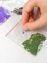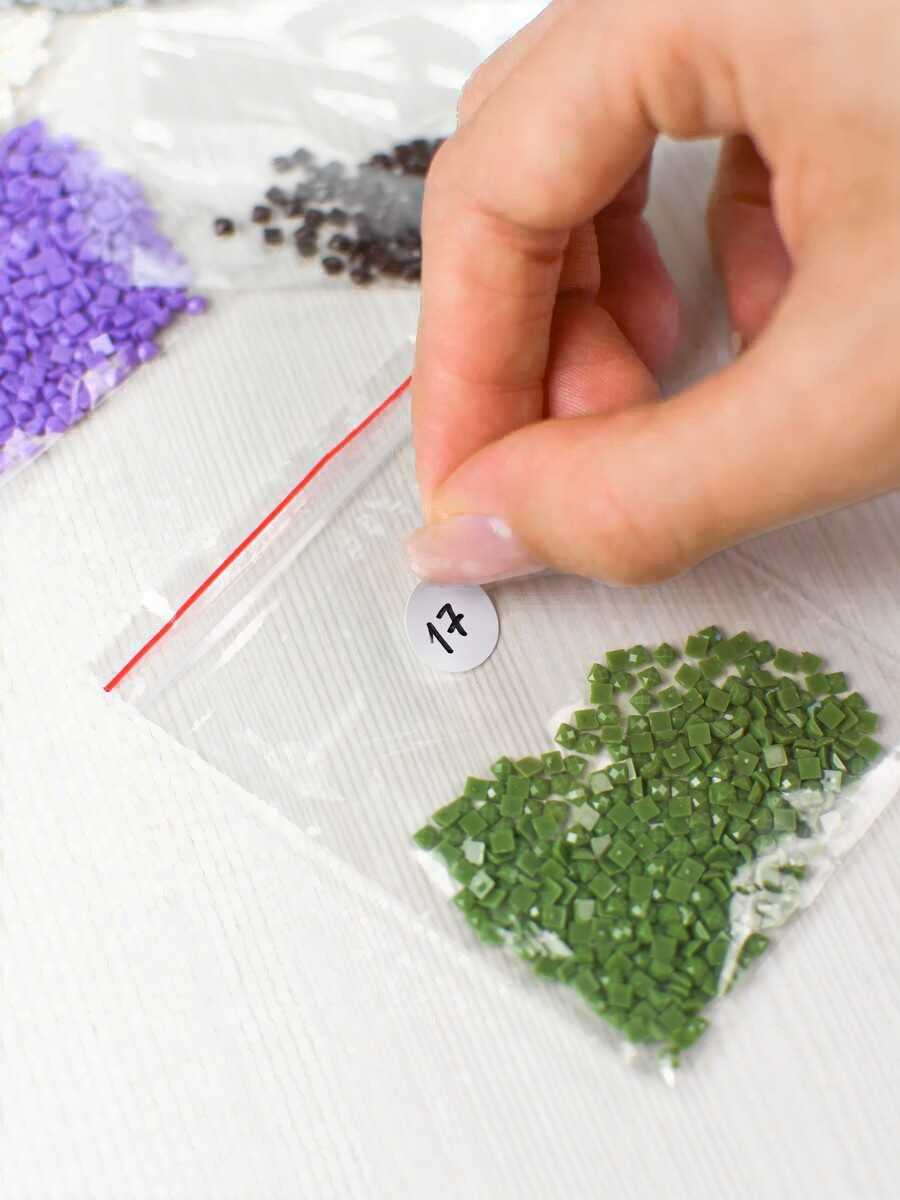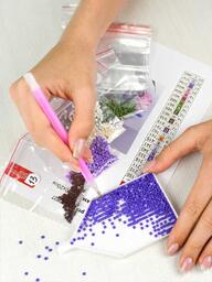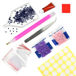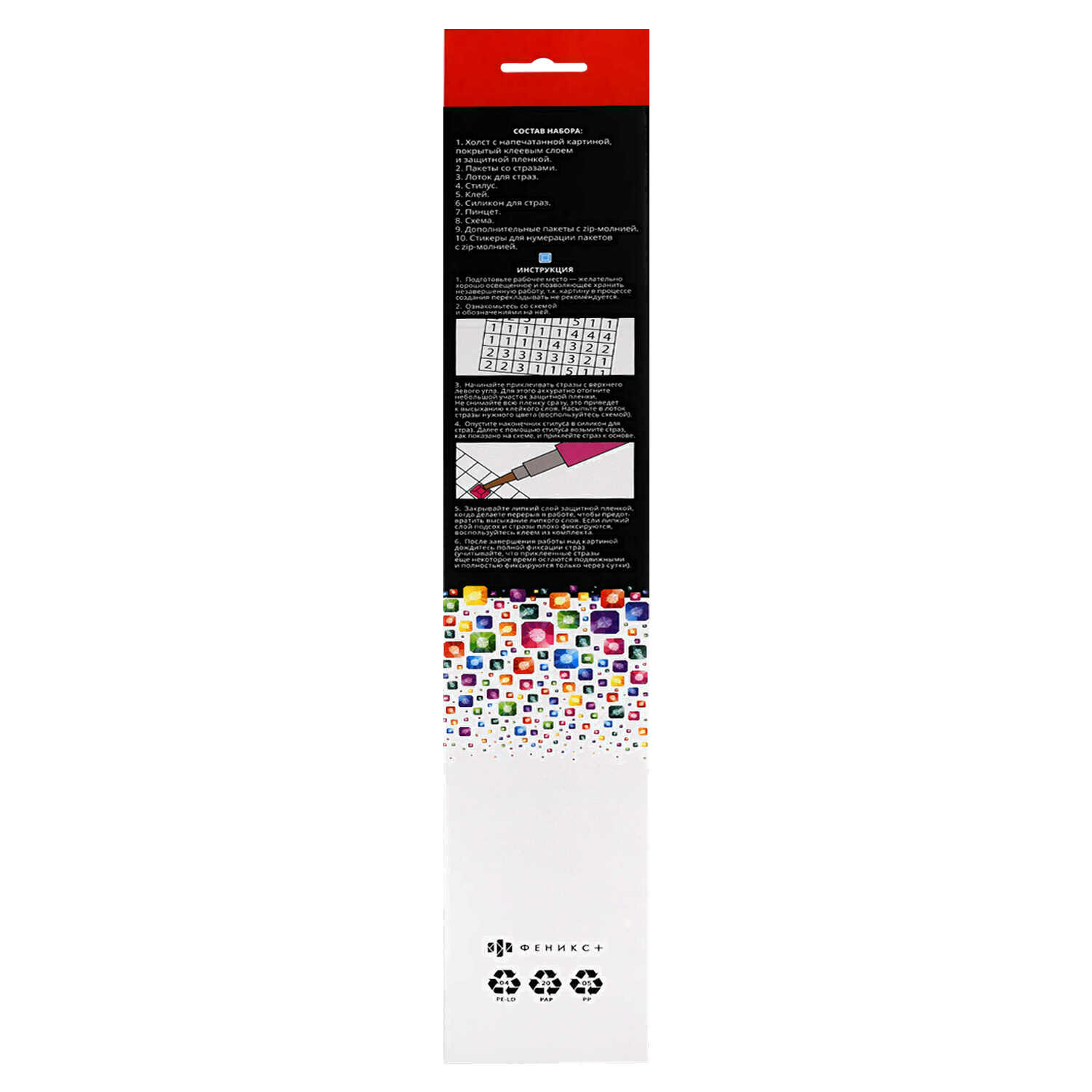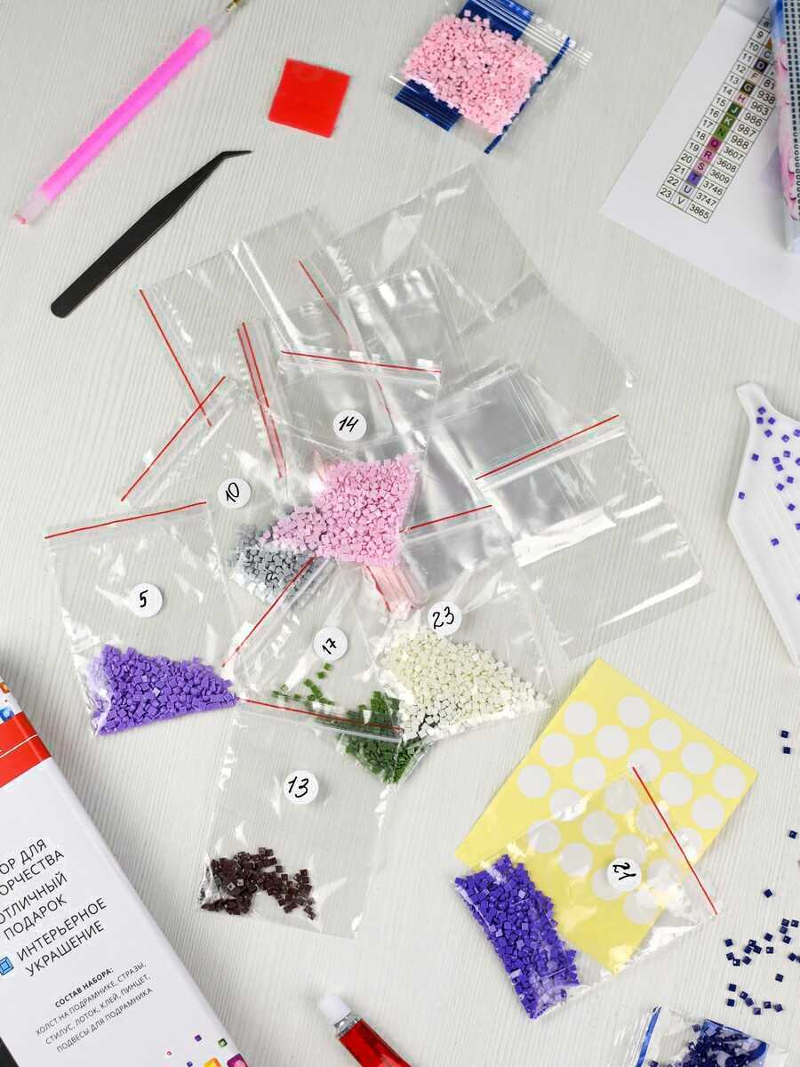 • Комплектация набора основа для картины, набор страз, лоток для страз, стилус, силиконовая подушечка, клей, пинцет, схема, пакеты с zip-молнией