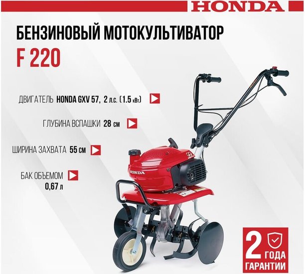 - ✅Бензиновый мотокультиватор Honda F 220 K1 DET2 - это удобное и надежное решение для обработки средней и мягкой почвы на небольших участках, площадью от 200 до 1000 м². Аппарат оснащен четырехтактным двигателем Honda GXV 57 мощностью 1500 Вт (2.04 л.с.), который отличается низким уровнем шума и вибраций, а также легким запуском благодаря автоматической декомпрессии.✅Рабочая ширина культивации регулируется в диапазоне от 31 до 54.5 см, что позволяет адаптировать устройство под различные задачи на участке. Глубина обработки достигает 28 см. Центробежное сцепление обеспечивает плавное и надежное включение, а червячный редуктор делает эксплуатацию аппарата простой и долговечной.✅Модель предусматривает установку дополнительного навесного оборудования без специальных инструментов, что расширяет функционал культиватора для выполнения разнообразных работ на огороде или приусадебном участке. Для защиты соседних посадок по бокам фрез установлены специальные защитные диски.✅В комплекте поставляются мотокультиватор, 2-секционные фрезы, сошник, стальные крылья и переднее транспортировочное колесо. Регулируемая рукоятка подстраивается под удобную рабочую высоту, что делает процесс обработки земли максимально комфортным для пользователя. ✅Бензиновый мотокультиватор Honda F 220 K1 DET2 - это удобное и надежное решение для обработки средней и мягкой почвы на небольших участках, площадью от 200 до 1000 м². Аппарат оснащен четырехтактным двигателем Honda GXV 57 мощностью 1500 Вт (2.04 л.с.), который отличается низким уровнем шума и вибраций, а также легким запуском благодаря автоматической декомпрессии.✅Рабочая ширина культивации регулируется в диапазоне от 31 до 54.5 см, что позволяет адаптировать устройство под различные задачи на участке. Глубина обработки достигает 28 см. Центробежное сцепление обеспечивает плавное и надежное включение, а червячный редуктор делает эксплуатацию аппарата простой и долговечной.✅Модель предусматривает установку дополнительного навесного оборудования без специальных инструментов, что расширяет функционал культиватора для выполнения разнообразных работ на огороде или приусадебном участке. Для защиты соседних посадок по бокам фрез установлены специальные защитные диски.✅В комплекте поставляются мотокультиватор, 2-секционные фрезы, сошник, стальные крылья и переднее транспортировочное колесо. Регулируемая рукоятка подстраивается под удобную рабочую высоту, что делает процесс обработки земли максимально комфортным для пользователя.