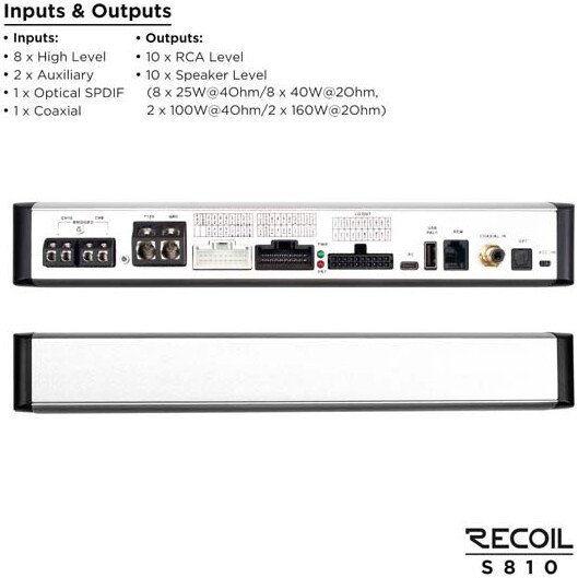 Усилители Recoil DSP поднимают планку на новый уровень, и не только с точки зрения качества звука.Эти новые усилители DSP обеспечивают исключительную функциональность настройки системы, точность и гибкость.У вас есть полный доступ к широкому выбору настроек Summing, Crossover, Delay, Level и EQ для точного достижения ваших аудиорезультатов.Вы можете сохранять, синхронизировать, загружать и делиться своим файлом настройки с другими.Независимо от того, являетесь ли вы новичком в аудио, страстным энтузиастом или аудиофилом, Recoil предоставляет вам в руки потрясающий набор инструментов настройки!Встроенный Bluetooth и USB модуль позволяет использовать этот процессор в качестве источника. Пульт DRC2 — продается отдельно!Усилители Recoil DSP поднимают планку на новый уровень, и не только с точки зрения качества звука.Эти новые усилители DSP обеспечивают исключительную функциональность настройки системы, точность и гибкость.У вас есть полный доступ к широкому выбору настроек Summing, Crossover, Delay, Level и EQ для точного достижения ваших аудиорезультатов.Вы можете сохранять, синхронизировать, загружать и делиться своим файлом настройки с другими.Независимо от того, являетесь ли вы новичком в аудио, страстным энтузиастом или аудиофилом, Recoil предоставляет вам в руки потрясающий набор инструментов настройки!Встроенный Bluetooth и USB модуль позволяет использовать этот процессор в качестве источника. Пульт DRC2 — продается отдельно!