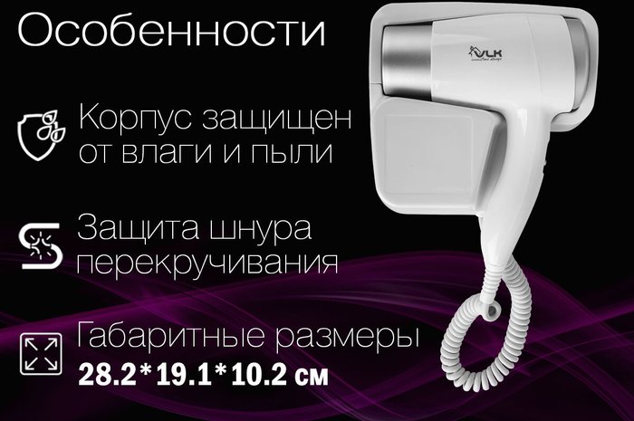 Фен для волос VLK STYLE-102 — отличный вариант, если вы ищете средство для сушки волос для гостиницы, отеля, бассейна, но также подойдет и для домашнего использования.Модель идет с настенным креплением и не займет много места в вашем пространстве — размер всей конструкции составляет 28,2*19,1*10,2 см. Фен легок и удобен. Будет комфортно держать его в руке и сушить волосы. Вес всего изделия составляет 725 г, а длина шнура — 0,9 м. Есть защита от перекручивания шнура.VLK STYLE-102 достаточно мощный — 1200 Вт. Оснащен 1 скоростным и 2 температурными режимами. Для безопасного использования предусмотрена защита от влаги и пыли.Бело-серебристая цветовая гамма фена — универсальное решение для любого интерьера.Фен для волос VLK STYLE-102 — отличный вариант, если вы ищете средство для сушки волос для гостиницы, отеля, бассейна, но также подойдет и для домашнего использования.Модель идет с настенным креплением и не займет много места в вашем пространстве — размер всей конструкции составляет 28,2*19,1*10,2 см. Фен легок и удобен. Будет комфортно держать его в руке и сушить волосы. Вес всего изделия составляет 725 г, а длина шнура — 0,9 м. Есть защита от перекручивания шнура.VLK STYLE-102 достаточно мощный — 1200 Вт. Оснащен 1 скоростным и 2 температурными режимами. Для безопасного использования предусмотрена защита от влаги и пыли.Бело-серебристая цветовая гамма фена — универсальное решение для любого интерьера.