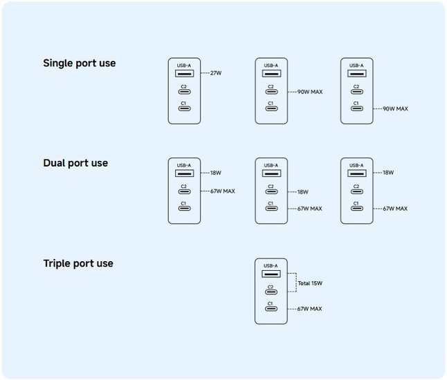 - ✅Ключевые характеристикиКомпактное сетевое зарядное устройство на 3 порта с максимальной суммарной мощностью 90 Вт, поддерживающее одновременную зарядку до трёх устройств, включая ноутбуки, смартфоны и планшеты. Каждый USB-C порт способен выдавать до 90 Вт, USB-A - до 27 Вт, что обеспечивает быструю и эффективную зарядку большинства современных гаджетов.✅Преимущества и отличияМодель выделяется поддержкой актуальных протоколов быстрой зарядки, включая Power Delivery, Quick Charge 3.0 и фирменную Hyper Charge, что гарантирует совместимость с широким спектром устройств и быстрый процесс пополнения энергии. Корпус выполнен из огнестойкого пластика для надежности и безопасности.✅ПрактичностьУстройство удобно брать с собой благодаря небольшим размерам и весу, а наличие трех разъемов позволяет одновременно заряжать ноутбук, смартфон и планшет, что особенно актуально для путешествий и работы вне дома. Нет необходимости носить несколько зарядных устройств для разных гаджетов.✅УникальностьОсобенностью является интеллектуальное распределение мощности между портами с возможностью одновременной быстрой зарядки двух устройств, а также расширенная система защиты от перегрева, перенапряжения и других нештатных ситуаций. Многоуровневая система безопасности повышает надежность эксплуатации и защищает подключенные устройства. ✅Ключевые характеристикиКомпактное сетевое зарядное устройство на 3 порта с максимальной суммарной мощностью 90 Вт, поддерживающее одновременную зарядку до трёх устройств, включая ноутбуки, смартфоны и планшеты. Каждый USB-C порт способен выдавать до 90 Вт, USB-A - до 27 Вт, что обеспечивает быструю и эффективную зарядку большинства современных гаджетов.✅Преимущества и отличияМодель выделяется поддержкой актуальных протоколов быстрой зарядки, включая Power Delivery, Quick Charge 3.0 и фирменную Hyper Charge, что гарантирует совместимость с широким спектром устройств и быстрый процесс пополнения энергии. Корпус выполнен из огнестойкого пластика для надежности и безопасности.✅ПрактичностьУстройство удобно брать с собой благодаря небольшим размерам и весу, а наличие трех разъемов позволяет одновременно заряжать ноутбук, смартфон и планшет, что особенно актуально для путешествий и работы вне дома. Нет необходимости носить несколько зарядных устройств для разных гаджетов.✅УникальностьОсобенностью является интеллектуальное распределение мощности между портами с возможностью одновременной быстрой зарядки двух устройств, а также расширенная система защиты от перегрева, перенапряжения и других нештатных ситуаций. Многоуровневая система безопасности повышает надежность эксплуатации и защищает подключенные устройства.