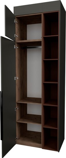 ✅Ключевые характеристикиШкаф распашной предназначен для хранения одежды и предметов общего назначения в различных помещениях: детской; жилой комнате; столовой; прихожей; спальне; офисе и гардеробной. Его модульная конструкция из ЛДСП класса Е0.5 обеспечивает экологичность и долговечность. Размеры изделия составляют 87.2 см в ширину; что позволяет эффективно использовать пространство.✅Преимущества и отличияМодель оснащена фурнитурой Blum и Hafele с доводчиками и TipOn-механизмами для удобного и бесшумного открывания дверей. Регулируемые металлические опоры компенсируют неровности пола; а крепления защищают шкаф от опрокидывания; что повышает безопасность эксплуатации. Фасады выполнены до пола без видимого цоколя; что придаёт изделию современный и аккуратный внешний вид.✅ПрактичностьШкаф легко собирается даже в узких помещениях и подходит для установки в нишу; угол или вдоль стены. Внутреннее наполнение включает две полки и одну штангу для одежды; а также пять открытых полок для удобного размещения различных предметов. Направляющие скрытого монтажа с доводчиками обеспечивают плавное и надёжное движение дверей.✅УникальностьВысота шкафа регулируется с помощью доборных элементов в диапазоне от 2450 до 2740 мм; что позволяет адаптировать изделие под индивидуальные параметры помещения. Использование ЛДСП с сертифицированным качеством ЕАЭС и сочетание материалов с декоративной кромкой ПВХ гарантируют высокое качество и эстетичность. Двухстороннее исполнение фасадов расширяет возможности размещения в интерьере.✅Ключевые характеристикиШкаф распашной предназначен для хранения одежды и предметов общего назначения в различных помещениях: детской; жилой комнате; столовой; прихожей; спальне; офисе и гардеробной. Его модульная конструкция из ЛДСП класса Е0.5 обеспечивает экологичность и долговечность. Размеры изделия составляют 87.2 см в ширину; что позволяет эффективно использовать пространство.✅Преимущества и отличияМодель оснащена фурнитурой Blum и Hafele с доводчиками и TipOn-механизмами для удобного и бесшумного открывания дверей. Регулируемые металлические опоры компенсируют неровности пола; а крепления защищают шкаф от опрокидывания; что повышает безопасность эксплуатации. Фасады выполнены до пола без видимого цоколя; что придаёт изделию современный и аккуратный внешний вид.✅ПрактичностьШкаф легко собирается даже в узких помещениях и подходит для установки в нишу; угол или вдоль стены. Внутреннее наполнение включает две полки и одну штангу для одежды; а также пять открытых полок для удобного размещения различных предметов. Направляющие скрытого монтажа с доводчиками обеспечивают плавное и надёжное движение дверей.✅УникальностьВысота шкафа регулируется с помощью доборных элементов в диапазоне от 2450 до 2740 мм; что позволяет адаптировать изделие под индивидуальные параметры помещения. Использование ЛДСП с сертифицированным качеством ЕАЭС и сочетание материалов с декоративной кромкой ПВХ гарантируют высокое качество и эстетичность. Двухстороннее исполнение фасадов расширяет возможности размещения в интерьере.
