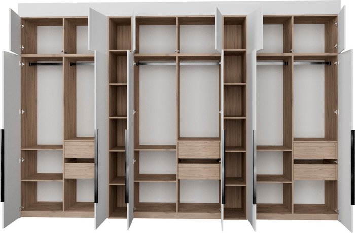 ✅Ключевые характеристикиШкаф распашной с модульной конструкцией предназначен для хранения общего назначения в различных помещениях: детской; жилой комнате; столовой; прихожей; спальне и офисе. Изготовлен из ЛДСП класса Е0,5 с сертифицированным качеством ЕАЭС; что гарантирует безопасность и долговечность. Размеры изделия составляют 387.2 на 60.6 на 274 см; что позволяет разместить его в нише; углу или вдоль стены. Вес шкафа составляет 605.92 кг.✅Преимущества и отличияФасады выполнены до пола без видимого цоколя; что придаёт изделию современный и аккуратный вид. Использование фурнитуры Blum и Hafele с доводчиками и TipOn-механизмами обеспечивает плавное и бесшумное закрывание дверей. Металлические регулируемые опоры компенсируют неровности пола; а крепления защищают шкаф от опрокидывания; повышая безопасность эксплуатации.✅ПрактичностьВнутреннее наполнение включает ящики; полки и штангу; что позволяет удобно организовать хранение различных вещей. Направляющие скрытого монтажа с доводчиками обеспечивают комфорт при использовании. Шкаф поставляется в разобранном виде; что облегчает транспортировку и сборку даже в узких помещениях. Высота регулируется с помощью доборных элементов в диапазоне от 2450 до 2740 мм.✅УникальностьДвухстороннее исполнение шкафа расширяет возможности его размещения в интерьере. Использование ЛДСП с ПВХ кромкой и сочетание светлого дерева с белым премиум фасадом создают стильный и современный дизайн. Высококачественная фурнитура с доводчиками и TipOn-механизмами выделяет изделие среди типичных решений; обеспечивая удобство и долговечность.✅Ключевые характеристикиШкаф распашной с модульной конструкцией предназначен для хранения общего назначения в различных помещениях: детской; жилой комнате; столовой; прихожей; спальне и офисе. Изготовлен из ЛДСП класса Е0,5 с сертифицированным качеством ЕАЭС; что гарантирует безопасность и долговечность. Размеры изделия составляют 387.2 на 60.6 на 274 см; что позволяет разместить его в нише; углу или вдоль стены. Вес шкафа составляет 605.92 кг.✅Преимущества и отличияФасады выполнены до пола без видимого цоколя; что придаёт изделию современный и аккуратный вид. Использование фурнитуры Blum и Hafele с доводчиками и TipOn-механизмами обеспечивает плавное и бесшумное закрывание дверей. Металлические регулируемые опоры компенсируют неровности пола; а крепления защищают шкаф от опрокидывания; повышая безопасность эксплуатации.✅ПрактичностьВнутреннее наполнение включает ящики; полки и штангу; что позволяет удобно организовать хранение различных вещей. Направляющие скрытого монтажа с доводчиками обеспечивают комфорт при использовании. Шкаф поставляется в разобранном виде; что облегчает транспортировку и сборку даже в узких помещениях. Высота регулируется с помощью доборных элементов в диапазоне от 2450 до 2740 мм.✅УникальностьДвухстороннее исполнение шкафа расширяет возможности его размещения в интерьере. Использование ЛДСП с ПВХ кромкой и сочетание светлого дерева с белым премиум фасадом создают стильный и современный дизайн. Высококачественная фурнитура с доводчиками и TipOn-механизмами выделяет изделие среди типичных решений; обеспечивая удобство и долговечность.