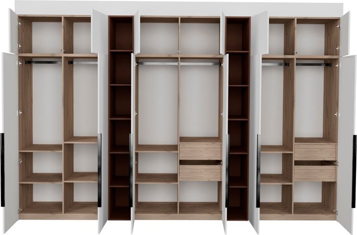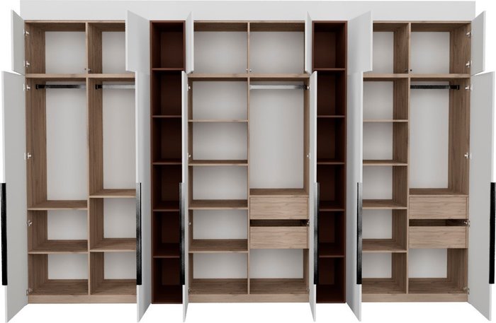 ✅Ключевые характеристикиШкаф распашной с модульной конструкцией предназначен для хранения одежды; книг и предметов общего назначения. Подходит для различных помещений: детской; жилой комнаты; столовой; прихожей; спальни и офиса. Общие размеры составляют 387.2 см в ширину; что обеспечивает вместительность и удобство использования.✅Преимущества и отличияМодель оснащена фурнитурой Blum и Hafele с доводчиками и TipOn-механизмами для комфортного открывания дверей. Регулируемые металлические опоры компенсируют неровности пола; а крепления защищают шкаф от опрокидывания. Фасады выполнены из ЛДСП класса Е0.5 с сертифицированным качеством ЕАЭС; что гарантирует безопасность и долговечность.✅ПрактичностьШкаф легко собирается даже в узких помещениях и может устанавливаться в нишу; угол или вдоль стены. Высота регулируется с помощью доборных элементов в диапазоне от 2450 до 2740 мм. Внутреннее наполнение включает 4 ящика; что позволяет удобно организовать хранение.✅УникальностьФасады доходят до пола без видимого цоколя; что придаёт изделию современный и аккуратный внешний вид. Направляющие скрытого монтажа с доводчиками обеспечивают плавное и бесшумное закрывание дверей. Двухстороннее исполнение и наличие антресоли расширяют функциональность и возможности размещения.✅Ключевые характеристикиШкаф распашной с модульной конструкцией предназначен для хранения одежды; книг и предметов общего назначения. Подходит для различных помещений: детской; жилой комнаты; столовой; прихожей; спальни и офиса. Общие размеры составляют 387.2 см в ширину; что обеспечивает вместительность и удобство использования.✅Преимущества и отличияМодель оснащена фурнитурой Blum и Hafele с доводчиками и TipOn-механизмами для комфортного открывания дверей. Регулируемые металлические опоры компенсируют неровности пола; а крепления защищают шкаф от опрокидывания. Фасады выполнены из ЛДСП класса Е0.5 с сертифицированным качеством ЕАЭС; что гарантирует безопасность и долговечность.✅ПрактичностьШкаф легко собирается даже в узких помещениях и может устанавливаться в нишу; угол или вдоль стены. Высота регулируется с помощью доборных элементов в диапазоне от 2450 до 2740 мм. Внутреннее наполнение включает 4 ящика; что позволяет удобно организовать хранение.✅УникальностьФасады доходят до пола без видимого цоколя; что придаёт изделию современный и аккуратный внешний вид. Направляющие скрытого монтажа с доводчиками обеспечивают плавное и бесшумное закрывание дверей. Двухстороннее исполнение и наличие антресоли расширяют функциональность и возможности размещения.