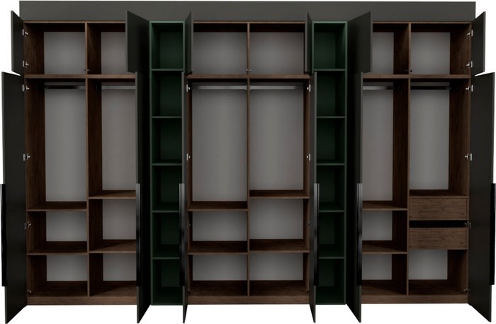 ✅Ключевые характеристикиШкаф распашной с модульной конструкцией предназначен для хранения общего назначения в различных помещениях: детской; жилой комнате; столовой; прихожей; спальне и офисе. Высота изделия регулируется в диапазоне от 2450 до 2740 мм с помощью доборных элементов. Общие габариты составляют 387.2 см в ширину; что обеспечивает долговечность и экологичность. Использование фурнитуры Blum и Hafele с доводчиками и tip-on механизмами гарантирует плавное и бесшумное открывание дверей и ящиков. Металлические регулируемые опоры компенсируют неровности пола; а крепления защищают шкаф от опрокидывания.✅ПрактичностьШкаф легко собирается даже в узких помещениях и подходит для установки в нишу; угол или вдоль стены. Внутреннее наполнение включает ящики; полки и штангу; что обеспечивает удобное хранение различных вещей. Направляющие скрытого монтажа с доводчиками повышают комфорт эксплуатации. Фасады идут до пола без видимого цоколя; что облегчает уборку.✅УникальностьДвухстороннее исполнение шкафа расширяет возможности размещения в помещении. Сертифицированное качество по стандарту ЕАЭС подтверждает безопасность и надежность материала. Модульная конструкция позволяет быстро и без ожидания изготовления получить готовое решение для хранения с современным дизайном и функциональностью.✅Ключевые характеристикиШкаф распашной с модульной конструкцией предназначен для хранения общего назначения в различных помещениях: детской; жилой комнате; столовой; прихожей; спальне и офисе. Высота изделия регулируется в диапазоне от 2450 до 2740 мм с помощью доборных элементов. Общие габариты составляют 387.2 см в ширину; что обеспечивает долговечность и экологичность. Использование фурнитуры Blum и Hafele с доводчиками и tip-on механизмами гарантирует плавное и бесшумное открывание дверей и ящиков. Металлические регулируемые опоры компенсируют неровности пола; а крепления защищают шкаф от опрокидывания.✅ПрактичностьШкаф легко собирается даже в узких помещениях и подходит для установки в нишу; угол или вдоль стены. Внутреннее наполнение включает ящики; полки и штангу; что обеспечивает удобное хранение различных вещей. Направляющие скрытого монтажа с доводчиками повышают комфорт эксплуатации. Фасады идут до пола без видимого цоколя; что облегчает уборку.✅УникальностьДвухстороннее исполнение шкафа расширяет возможности размещения в помещении. Сертифицированное качество по стандарту ЕАЭС подтверждает безопасность и надежность материала. Модульная конструкция позволяет быстро и без ожидания изготовления получить готовое решение для хранения с современным дизайном и функциональностью.