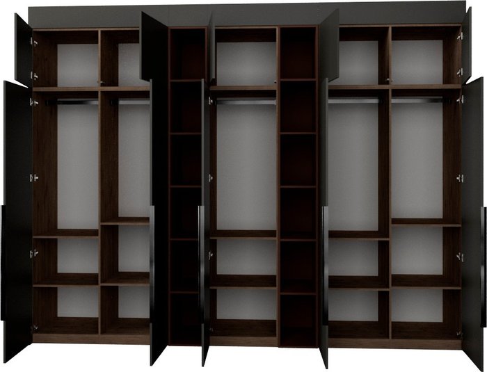 ✅Ключевые характеристикиШкаф представляет собой готовую к установке модульную конструкцию с пятью распашными дверцами и десятью открытыми полками. Высота регулируется с помощью доборных элементов в диапазоне от 2450 до 2740 мм; что позволяет адаптировать мебель под разные помещения. Изготовлен из ЛДСП класса Е0.5 с использованием качественной фурнитуры Blum и Hafele; обеспечивающей плавное и бесшумное закрывание дверей.✅Преимущества и отличияМодель оснащена доводчиками и механизмом открытия при нажатии TipOn; что повышает удобство эксплуатации. Регулируемые металлические опоры компенсируют неровности пола; а крепления защищают шкаф от опрокидывания; обеспечивая безопасность и стабильность. Фасады выполнены до пола без видимого цоколя; что придаёт изделию современный и аккуратный внешний вид.✅ПрактичностьШкаф подходит для хранения одежды и предметов общего назначения; благодаря наличию пяти штанг и множества полок. Его можно использовать в различных помещениях: детской; спальне; прихожей; офисе и столовой. Конструкция легко собирается даже в узких пространствах; что облегчает монтаж и последующую эксплуатацию.✅УникальностьДвухстороннее исполнение и модульная система позволяют гибко размещать шкаф в нишах; углах или вдоль стены. Использование сертифицированных материалов и фурнитуры высокого качества гарантирует долговечность и надёжность изделия; выделяя его среди типичных решений для хранения.✅Ключевые характеристикиШкаф представляет собой готовую к установке модульную конструкцию с пятью распашными дверцами и десятью открытыми полками. Высота регулируется с помощью доборных элементов в диапазоне от 2450 до 2740 мм; что позволяет адаптировать мебель под разные помещения. Изготовлен из ЛДСП класса Е0.5 с использованием качественной фурнитуры Blum и Hafele; обеспечивающей плавное и бесшумное закрывание дверей.✅Преимущества и отличияМодель оснащена доводчиками и механизмом открытия при нажатии TipOn; что повышает удобство эксплуатации. Регулируемые металлические опоры компенсируют неровности пола; а крепления защищают шкаф от опрокидывания; обеспечивая безопасность и стабильность. Фасады выполнены до пола без видимого цоколя; что придаёт изделию современный и аккуратный внешний вид.✅ПрактичностьШкаф подходит для хранения одежды и предметов общего назначения; благодаря наличию пяти штанг и множества полок. Его можно использовать в различных помещениях: детской; спальне; прихожей; офисе и столовой. Конструкция легко собирается даже в узких пространствах; что облегчает монтаж и последующую эксплуатацию.✅УникальностьДвухстороннее исполнение и модульная система позволяют гибко размещать шкаф в нишах; углах или вдоль стены. Использование сертифицированных материалов и фурнитуры высокого качества гарантирует долговечность и надёжность изделия; выделяя его среди типичных решений для хранения.