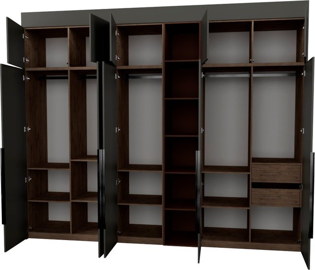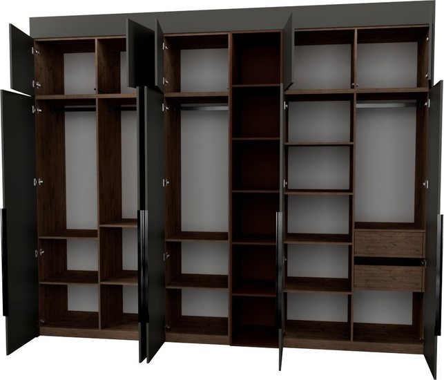 ✅Ключевые характеристикиШкаф представляет собой готовую к установке модульную конструкцию с распашными дверцами и пятью открытыми полками. Его размеры составляют 313.2 на 60.6 на 274 см; что позволяет эффективно использовать пространство в различных помещениях; включая жилые комнаты; спальни; прихожие; офисы и гардеробные. Внутреннее наполнение включает ящики; полки и штанги для одежды; обеспечивая удобное хранение вещей общего назначения и одежды.✅Преимущества и отличияМодель оснащена фурнитурой Blum и Hafele с доводчиками и механизмом TipOn для бесшумного и удобного открывания дверей и ящиков. Регулируемые металлические опоры компенсируют неровности пола; а крепления защищают шкаф от опрокидывания; что повышает безопасность и устойчивость конструкции. Фасады выполнены из ЛДСП класса Е0.5 с сертифицированным качеством; что гарантирует экологичность и долговечность.✅ПрактичностьШкаф легко собирается даже в узких помещениях и подходит для установки в нишу; угол или вдоль стены. Высота регулируется с помощью доборных элементов; что позволяет адаптировать мебель под индивидуальные параметры помещения. Направляющие скрытого монтажа с доводчиками обеспечивают плавное и надежное движение дверей и ящиков; а отсутствие видимого цоколя создает современный и аккуратный внешний вид.✅УникальностьДвухстороннее исполнение и наличие антресоли расширяют функциональность и возможности хранения. Использование качественной фурнитуры с механизмами TipOn и доводчиками; а также регулируемые опоры и защита от опрокидывания выделяют эту модель среди типичных решений; обеспечивая комфорт и безопасность в эксплуатации.✅Ключевые характеристикиШкаф представляет собой готовую к установке модульную конструкцию с распашными дверцами и пятью открытыми полками. Его размеры составляют 313.2 на 60.6 на 274 см; что позволяет эффективно использовать пространство в различных помещениях; включая жилые комнаты; спальни; прихожие; офисы и гардеробные. Внутреннее наполнение включает ящики; полки и штанги для одежды; обеспечивая удобное хранение вещей общего назначения и одежды.✅Преимущества и отличияМодель оснащена фурнитурой Blum и Hafele с доводчиками и механизмом TipOn для бесшумного и удобного открывания дверей и ящиков. Регулируемые металлические опоры компенсируют неровности пола; а крепления защищают шкаф от опрокидывания; что повышает безопасность и устойчивость конструкции. Фасады выполнены из ЛДСП класса Е0.5 с сертифицированным качеством; что гарантирует экологичность и долговечность.✅ПрактичностьШкаф легко собирается даже в узких помещениях и подходит для установки в нишу; угол или вдоль стены. Высота регулируется с помощью доборных элементов; что позволяет адаптировать мебель под индивидуальные параметры помещения. Направляющие скрытого монтажа с доводчиками обеспечивают плавное и надежное движение дверей и ящиков; а отсутствие видимого цоколя создает современный и аккуратный внешний вид.✅УникальностьДвухстороннее исполнение и наличие антресоли расширяют функциональность и возможности хранения. Использование качественной фурнитуры с механизмами TipOn и доводчиками; а также регулируемые опоры и защита от опрокидывания выделяют эту модель среди типичных решений; обеспечивая комфорт и безопасность в эксплуатации.