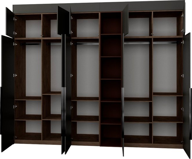 ✅Ключевые характеристикиШкаф представляет собой готовую к установке модульную конструкцию с распашными дверцами и вместительным внутренним наполнением; включающим 10 полок и 5 штанг для одежды. Высота изделия регулируется с помощью доборных элементов в диапазоне от 2450 до 2740 мм; что позволяет адаптировать шкаф под разные помещения. Материалы корпуса и фасадов выполнены из ЛДСП класса Е0.5 с сертифицированным качеством ЕАЭС; обеспечивая экологичность и долговечность.✅Преимущества и отличияМодель оснащена фурнитурой Blum и Hafele с доводчиками и механизмами TipOn для удобного бесшумного открывания дверей. Регулируемые металлические опоры компенсируют неровности пола; а специальные крепления защищают шкаф от опрокидывания; что повышает безопасность эксплуатации. Фасады выполнены до пола без видимого цоколя; что придаёт изделию современный и аккуратный внешний вид.✅ПрактичностьШкаф подходит для различных помещений: детской; спальни; прихожей; офиса и столовой; благодаря универсальному дизайну и функциональному наполнению. Наличие открытых полок и антресоли расширяет возможности хранения и организации пространства. Форма поставки в разобранном виде облегчает транспортировку и сборку даже в узких помещениях.✅УникальностьДвухстороннее исполнение шкафа позволяет использовать его в нишах и углах; что повышает гибкость размещения в интерьере. Использование качественной фурнитуры с доводчиками и механизмами TipOn обеспечивает комфорт и долговечность в эксплуатации. Металлические регулируемые опоры и защита от опрокидывания делают конструкцию надёжной и безопасной.✅Ключевые характеристикиШкаф представляет собой готовую к установке модульную конструкцию с распашными дверцами и вместительным внутренним наполнением; включающим 10 полок и 5 штанг для одежды. Высота изделия регулируется с помощью доборных элементов в диапазоне от 2450 до 2740 мм; что позволяет адаптировать шкаф под разные помещения. Материалы корпуса и фасадов выполнены из ЛДСП класса Е0.5 с сертифицированным качеством ЕАЭС; обеспечивая экологичность и долговечность.✅Преимущества и отличияМодель оснащена фурнитурой Blum и Hafele с доводчиками и механизмами TipOn для удобного бесшумного открывания дверей. Регулируемые металлические опоры компенсируют неровности пола; а специальные крепления защищают шкаф от опрокидывания; что повышает безопасность эксплуатации. Фасады выполнены до пола без видимого цоколя; что придаёт изделию современный и аккуратный внешний вид.✅ПрактичностьШкаф подходит для различных помещений: детской; спальни; прихожей; офиса и столовой; благодаря универсальному дизайну и функциональному наполнению. Наличие открытых полок и антресоли расширяет возможности хранения и организации пространства. Форма поставки в разобранном виде облегчает транспортировку и сборку даже в узких помещениях.✅УникальностьДвухстороннее исполнение шкафа позволяет использовать его в нишах и углах; что повышает гибкость размещения в интерьере. Использование качественной фурнитуры с доводчиками и механизмами TipOn обеспечивает комфорт и долговечность в эксплуатации. Металлические регулируемые опоры и защита от опрокидывания делают конструкцию надёжной и безопасной.