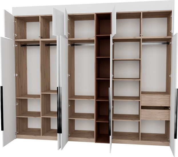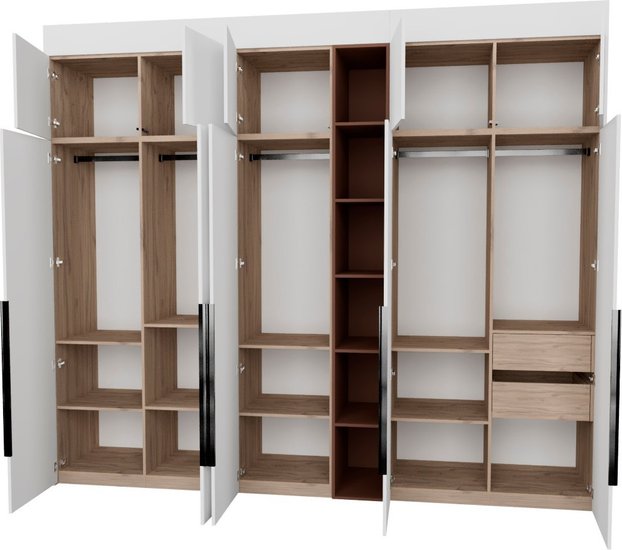 ✅Ключевые характеристикиШкаф распашной предназначен для хранения одежды и предметов общего назначения в различных помещениях: детской; жилой комнате; столовой; прихожей; спальне; офисе и гардеробной. Модель имеет модульную конструкцию из ЛДСП класса Е0.5 с сертифицированным качеством ЕАЭС; что гарантирует экологичность и безопасность. Размеры шкафа составляют 303.2 на 60.6 на 274 см; что позволяет вместить большое количество вещей.✅Преимущества и отличияФасады выполнены до пола без видимого цоколя; что придаёт изделию современный и аккуратный вид. Использование фурнитуры Blum и Hafele с доводчиками и TipOn-механизмами обеспечивает плавное и бесшумное открывание дверей. Регулируемые металлические опоры компенсируют неровности пола; а крепления защищают шкаф от опрокидывания; повышая безопасность эксплуатации.✅ПрактичностьВнутреннее наполнение включает 2 ящика; а также 5 открытых полок; что обеспечивает удобную организацию хранения. Шкаф поставляется в разобранном виде; что облегчает транспортировку и сборку даже в узких помещениях. Высота регулируется с помощью доборных элементов в диапазоне от 2450 до 2740 мм; что позволяет адаптировать шкаф под разные потолки.✅УникальностьДвухстороннее исполнение шкафа расширяет возможности его размещения в комнате. Использование ЛДСП с ПВХ кромкой и качественной фурнитуры с механизмами TipOn и доводчиками выделяет модель среди типичных решений; обеспечивая долговечность и комфорт в использовании.✅Ключевые характеристикиШкаф распашной предназначен для хранения одежды и предметов общего назначения в различных помещениях: детской; жилой комнате; столовой; прихожей; спальне; офисе и гардеробной. Модель имеет модульную конструкцию из ЛДСП класса Е0.5 с сертифицированным качеством ЕАЭС; что гарантирует экологичность и безопасность. Размеры шкафа составляют 303.2 на 60.6 на 274 см; что позволяет вместить большое количество вещей.✅Преимущества и отличияФасады выполнены до пола без видимого цоколя; что придаёт изделию современный и аккуратный вид. Использование фурнитуры Blum и Hafele с доводчиками и TipOn-механизмами обеспечивает плавное и бесшумное открывание дверей. Регулируемые металлические опоры компенсируют неровности пола; а крепления защищают шкаф от опрокидывания; повышая безопасность эксплуатации.✅ПрактичностьВнутреннее наполнение включает 2 ящика; а также 5 открытых полок; что обеспечивает удобную организацию хранения. Шкаф поставляется в разобранном виде; что облегчает транспортировку и сборку даже в узких помещениях. Высота регулируется с помощью доборных элементов в диапазоне от 2450 до 2740 мм; что позволяет адаптировать шкаф под разные потолки.✅УникальностьДвухстороннее исполнение шкафа расширяет возможности его размещения в комнате. Использование ЛДСП с ПВХ кромкой и качественной фурнитуры с механизмами TipOn и доводчиками выделяет модель среди типичных решений; обеспечивая долговечность и комфорт в использовании.