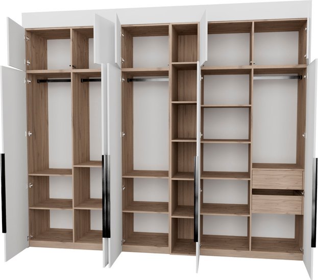 ✅Ключевые характеристикиШкаф распашной с модульной конструкцией предназначен для хранения общего назначения в различных помещениях: детской; жилой комнате; столовой; прихожей; спальне и офисе. Изготовлен из ЛДСП класса Е0,5 с сертифицированным качеством ЕАЭС; что гарантирует экологичность и безопасность. Размеры изделия составляют 303.2 на 60.6 на 274 см; что позволяет вместить большое количество вещей.✅Преимущества и отличияМодель оснащена фурнитурой Blum и Hafele с доводчиками и TipOn-механизмами; обеспечивающими плавное и бесшумное закрывание дверей. Регулируемые металлические опоры компенсируют неровности пола; а крепления защищают шкаф от опрокидывания; что повышает безопасность использования. Фасады выполнены до пола без видимого цоколя; что придаёт изделию современный и аккуратный внешний вид.✅ПрактичностьШкаф легко собирается даже в узких помещениях и подходит для установки в нишу; угол или вдоль стены. Высота регулируется с помощью доборных элементов в диапазоне от 2450 до 2740 мм; что позволяет адаптировать мебель под конкретные условия помещения. Внутреннее наполнение включает ящики; полки и штангу; что обеспечивает удобное размещение одежды и других предметов.✅УникальностьДвухстороннее исполнение и наличие антресоли расширяют функциональность шкафа; позволяя использовать его с обеих сторон и увеличивать объём хранения. Использование направляющих скрытого монтажа с доводчиками повышает эстетичность и комфорт эксплуатации. Материал кромки каркаса из ПВХ обеспечивает долговечность и защиту от повреждений; что выделяет эту модель среди аналогичных решений.✅Ключевые характеристикиШкаф распашной с модульной конструкцией предназначен для хранения общего назначения в различных помещениях: детской; жилой комнате; столовой; прихожей; спальне и офисе. Изготовлен из ЛДСП класса Е0,5 с сертифицированным качеством ЕАЭС; что гарантирует экологичность и безопасность. Размеры изделия составляют 303.2 на 60.6 на 274 см; что позволяет вместить большое количество вещей.✅Преимущества и отличияМодель оснащена фурнитурой Blum и Hafele с доводчиками и TipOn-механизмами; обеспечивающими плавное и бесшумное закрывание дверей. Регулируемые металлические опоры компенсируют неровности пола; а крепления защищают шкаф от опрокидывания; что повышает безопасность использования. Фасады выполнены до пола без видимого цоколя; что придаёт изделию современный и аккуратный внешний вид.✅ПрактичностьШкаф легко собирается даже в узких помещениях и подходит для установки в нишу; угол или вдоль стены. Высота регулируется с помощью доборных элементов в диапазоне от 2450 до 2740 мм; что позволяет адаптировать мебель под конкретные условия помещения. Внутреннее наполнение включает ящики; полки и штангу; что обеспечивает удобное размещение одежды и других предметов.✅УникальностьДвухстороннее исполнение и наличие антресоли расширяют функциональность шкафа; позволяя использовать его с обеих сторон и увеличивать объём хранения. Использование направляющих скрытого монтажа с доводчиками повышает эстетичность и комфорт эксплуатации. Материал кромки каркаса из ПВХ обеспечивает долговечность и защиту от повреждений; что выделяет эту модель среди аналогичных решений.