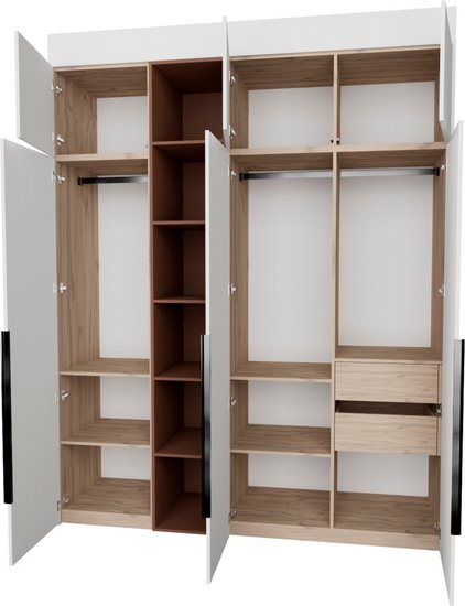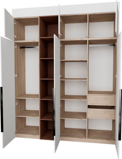 ✅Ключевые характеристикиШкаф представляет собой готовую к сборке модульную конструкцию с распашными дверцами и шестью дверями. Он подходит для различных помещений; включая детскую; жилую комнату; столовую; прихожую; спальню и офис. Высота регулируется с помощью доборных элементов в диапазоне от 2450 до 2740 мм; что позволяет адаптировать шкаф под разные потолки и ниши. Материалы корпуса и фасада выполнены из ЛДСП класса Е0.5 с качественной кромкой ПВХ; обеспечивая долговечность и безопасность.✅Преимущества и отличияФурнитура от известных производителей Blum и Hafele оснащена доводчиками и tip-on механизмами для плавного и бесшумного закрывания дверей и ящиков. Металлические регулируемые опоры компенсируют неровности пола; а специальные крепления защищают шкаф от опрокидывания; что повышает безопасность эксплуатации. Фасады выполнены до пола без видимого цоколя; что придаёт изделию современный и аккуратный внешний вид.✅ПрактичностьВнутреннее наполнение включает ящики; полки и штангу для одежды; что обеспечивает удобное хранение различных предметов. Направляющие скрытого монтажа с доводчиками гарантируют плавное открывание и закрывание ящиков. Шкаф поставляется в разобранном виде; что облегчает транспортировку и сборку даже в узких помещениях. Двухстороннее исполнение позволяет устанавливать шкаф в нишу; угол или вдоль стены.✅УникальностьИспользование сертифицированных материалов и фурнитуры высокого качества обеспечивает надежность и долговечность конструкции. Регулируемая высота с помощью доборных элементов и отсутствие видимого цоколя делают шкаф универсальным решением для помещений с разной планировкой и стилем. Защита от опрокидывания и продуманная конструкция металлических опор выделяют этот шкаф среди типичных решений для хранения общего назначения.✅Ключевые характеристикиШкаф представляет собой готовую к сборке модульную конструкцию с распашными дверцами и шестью дверями. Он подходит для различных помещений; включая детскую; жилую комнату; столовую; прихожую; спальню и офис. Высота регулируется с помощью доборных элементов в диапазоне от 2450 до 2740 мм; что позволяет адаптировать шкаф под разные потолки и ниши. Материалы корпуса и фасада выполнены из ЛДСП класса Е0.5 с качественной кромкой ПВХ; обеспечивая долговечность и безопасность.✅Преимущества и отличияФурнитура от известных производителей Blum и Hafele оснащена доводчиками и tip-on механизмами для плавного и бесшумного закрывания дверей и ящиков. Металлические регулируемые опоры компенсируют неровности пола; а специальные крепления защищают шкаф от опрокидывания; что повышает безопасность эксплуатации. Фасады выполнены до пола без видимого цоколя; что придаёт изделию современный и аккуратный внешний вид.✅ПрактичностьВнутреннее наполнение включает ящики; полки и штангу для одежды; что обеспечивает удобное хранение различных предметов. Направляющие скрытого монтажа с доводчиками гарантируют плавное открывание и закрывание ящиков. Шкаф поставляется в разобранном виде; что облегчает транспортировку и сборку даже в узких помещениях. Двухстороннее исполнение позволяет устанавливать шкаф в нишу; угол или вдоль стены.✅УникальностьИспользование сертифицированных материалов и фурнитуры высокого качества обеспечивает надежность и долговеч