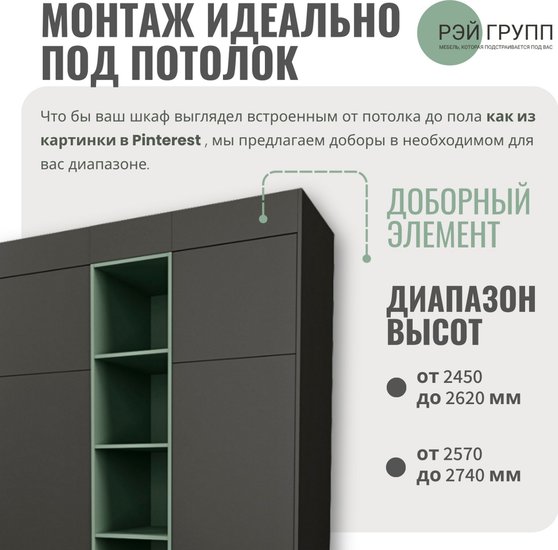 ✅Ключевые характеристикиШкаф распашной предназначен для хранения общего назначения и подходит для различных помещений: детской; жилой комнаты; столовой; прихожей; спальни и офиса. Его размеры составляют 205.2 на 60.6 на 262 см; что обеспечивает вместительность и удобство использования. Модель выполнена из ЛДСП класса е0.5 с сертифицированным качеством; что гарантирует безопасность и долговечность.✅Преимущества и отличияОсобенностью конструкции является модульный формат; позволяющий легко собирать шкаф даже в узких помещениях. Фасады идут до пола без видимого цоколя; а фурнитура от известных производителей Blum и Hafele оснащена доводчиками и tip-on механизмами для плавного и бесшумного закрывания дверей. Металлические регулируемые опоры компенсируют неровности пола; а крепления защищают от опрокидывания.✅ПрактичностьШкаф оснащён полками и штангой для удобного размещения одежды и других вещей. Дверцы распашные с доводчиками и скрытыми направляющими; что повышает комфорт эксплуатации. Высота регулируется с помощью доборных элементов в диапазоне от 2450 до 2740 мм; что позволяет адаптировать шкаф под разные потолки и ниши.✅УникальностьМодель выделяется двухсторонним исполнением; что расширяет возможности размещения в помещении. Использование качественной фурнитуры с механизмами tip-on и доводчиками обеспечивает современный уровень комфорта. Регулируемые металлические опоры и защита от опрокидывания повышают безопасность и устойчивость конструкции.✅Ключевые характеристикиШкаф распашной предназначен для хранения общего назначения и подходит для различных помещений: детской; жилой комнаты; столовой; прихожей; спальни и офиса. Его размеры составляют 205.2 на 60.6 на 262 см; что обеспечивает вместительность и удобство использования. Модель выполнена из ЛДСП класса е0.5 с сертифицированным качеством; что гарантирует безопасность и долговечность.✅Преимущества и отличияОсобенностью конструкции является модульный формат; позволяющий легко собирать шкаф даже в узких помещениях. Фасады идут до пола без видимого цоколя; а фурнитура от известных производителей Blum и Hafele оснащена доводчиками и tip-on механизмами для плавного и бесшумного закрывания дверей. Металлические регулируемые опоры компенсируют неровности пола; а крепления защищают от опрокидывания.✅ПрактичностьШкаф оснащён полками и штангой для удобного размещения одежды и других вещей. Дверцы распашные с доводчиками и скрытыми направляющими; что повышает комфорт эксплуатации. Высота регулируется с помощью доборных элементов в диапазоне от 2450 до 2740 мм; что позволяет адаптировать шкаф под разные потолки и ниши.✅УникальностьМодель выделяется двухсторонним исполнением; что расширяет возможности размещения в помещении. Использование качественной фурнитуры с механизмами tip-on и доводчиками обеспечивает современный уровень комфорта. Регулируемые металлические опоры и защита от опрокидывания повышают безопасность и устойчивость конструкции.