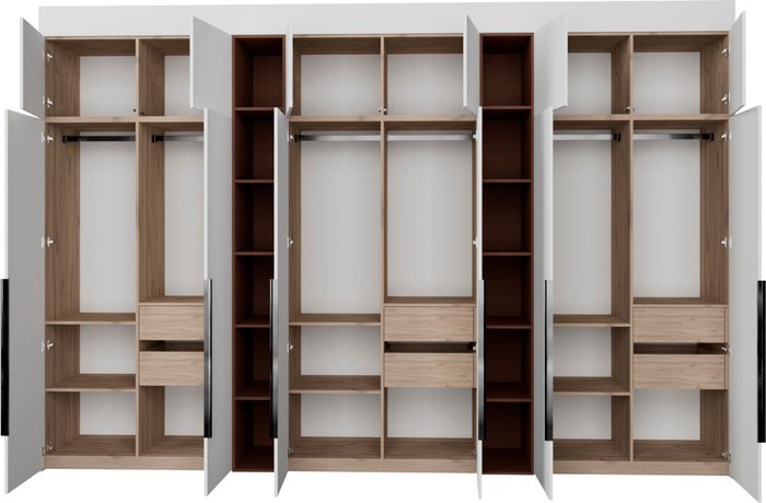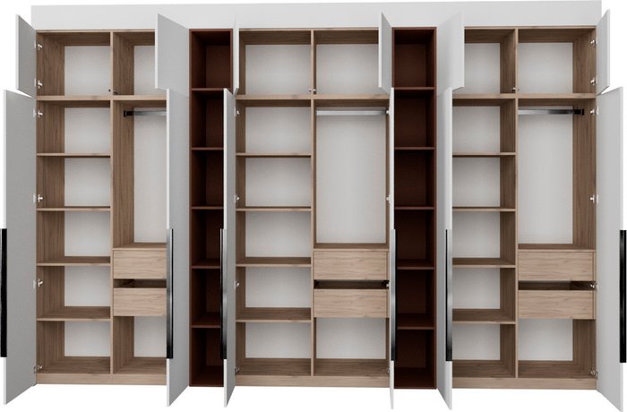 ✅Ключевые характеристикиШкаф представляет собой готовую к установке модульную конструкцию с распашными дверцами; предназначенную для хранения общего назначения в различных помещениях: детской; жилой комнате; столовой; прихожей; спальне и офисе. Его размеры составляют 387.2 см в ширину; что обеспечивает вместительность и удобство использования. Материалы корпуса и фасада выполнены из ЛДСП класса Е0,5 с качественной ПВХ кромкой; что гарантирует долговечность и экологичность.✅Преимущества и отличияМодель оснащена фурнитурой Blum и Hafele с доводчиками и TipOn-механизмами; обеспечивающими плавное и бесшумное закрывание дверей. Регулируемые металлические опоры компенсируют неровности пола; а крепления защищают шкаф от опрокидывания; что повышает безопасность эксплуатации. Фасады выполнены до пола без видимого цоколя; что придаёт изделию современный и аккуратный внешний вид.✅ПрактичностьШкаф легко собирается даже в узких помещениях и может устанавливаться в нишу; угол или вдоль стены. Высота регулируется с помощью доборных элементов в диапазоне от 2450 до 2740 мм; что позволяет адаптировать мебель под индивидуальные параметры помещения. Внутреннее наполнение включает ящики; полки и штангу; что обеспечивает удобное хранение различных вещей.✅УникальностьДвухстороннее исполнение и наличие антресоли расширяют функциональность шкафа; позволяя использовать его с обеих сторон и увеличивать объём хранения. Скрытые направляющие с доводчиками и мебельные замки отсутствуют; что упрощает эксплуатацию и обслуживание. Использование сертифицированных материалов и фурнитуры премиум-класса подчёркивает высокое качество и надёжность изделия.✅Ключевые характеристикиШкаф представляет собой готовую к установке модульную конструкцию с распашными дверцами; предназначенную для хранения общего назначения в различных помещениях: детской; жилой комнате; столовой; прихожей; спальне и офисе. Его размеры составляют 387.2 см в ширину; что обеспечивает вместительность и удобство использования. Материалы корпуса и фасада выполнены из ЛДСП класса Е0,5 с качественной ПВХ кромкой; что гарантирует долговечность и экологичность.✅Преимущества и отличияМодель оснащена фурнитурой Blum и Hafele с доводчиками и TipOn-механизмами; обеспечивающими плавное и бесшумное закрывание дверей. Регулируемые металлические опоры компенсируют неровности пола; а крепления защищают шкаф от опрокидывания; что повышает безопасность эксплуатации. Фасады выполнены до пола без видимого цоколя; что придаёт изделию современный и аккуратный внешний вид.✅ПрактичностьШкаф легко собирается даже в узких помещениях и может устанавливаться в нишу; угол или вдоль стены. Высота регулируется с помощью доборных элементов в диапазоне от 2450 до 2740 мм; что позволяет адаптировать мебель под индивидуальные параметры помещения. Внутреннее наполнение включает ящики; полки и штангу; что обеспечивает удобное хранение различных вещей.✅УникальностьДвухстороннее исполнение и наличие антресоли расширяют функциональность шкафа; позволяя использовать его с обеих сторон и увеличивать объём хранения. Скрытые направляющие с доводчиками и мебельные замки отсутствуют; что упрощает эксплуатацию и обслуживание. Использование сертифицированных материалов и фурнитуры премиум-класса подчёркивает в