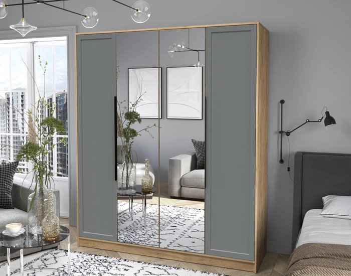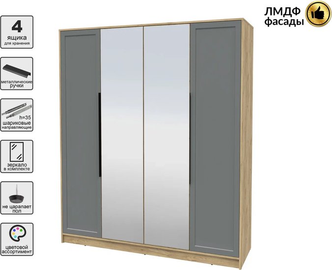 ✅Ключевые характеристикиРаспашной шкаф предназначен для хранения одежды и других вещей в жилой комнате или спальне. Модель оснащена четырьмя дверцами; внутри расположены десять полок; две штанги для одежды и четыре ящика; что обеспечивает удобное и функциональное хранение. Размеры шкафа составляют 180 на 54.7 на 212.8 см; что позволяет разместить его в просторных помещениях.✅Преимущества и отличияФасад выполнен из ЛМДФ с имитацией составного дизайна; что придаёт мебели современный и стильный вид. Металлические ручки и чёрная фурнитура обеспечивают долговечность и удобство эксплуатации. Наличие зеркала на фасаде добавляет функциональности и визуально расширяет пространство комнаты.✅ПрактичностьШкаф поставляется в разобранном виде; что облегчает транспортировку и сборку. Напольная установка позволяет устойчиво разместить шкаф в любом удобном месте. Модульная конструкция даёт возможность интегрировать шкаф в систему мебели; адаптируя под индивидуальные потребности.✅УникальностьДизайн с имитацией составного фасада и сочетание серого цвета с древесным оттенком каркаса создают гармоничный и современный образ. Продуманное внутреннее наполнение с большим количеством полок и ящиков обеспечивает универсальность использования без дополнительных аксессуаров.✅Ключевые характеристикиРаспашной шкаф предназначен для хранения одежды и других вещей в жилой комнате или спальне. Модель оснащена четырьмя дверцами; внутри расположены десять полок; две штанги для одежды и четыре ящика; что обеспечивает удобное и функциональное хранение. Размеры шкафа составляют 180 на 54.7 на 212.8 см; что позволяет разместить его в просторных помещениях.✅Преимущества и отличияФасад выполнен из ЛМДФ с имитацией составного дизайна; что придаёт мебели современный и стильный вид. Металлические ручки и чёрная фурнитура обеспечивают долговечность и удобство эксплуатации. Наличие зеркала на фасаде добавляет функциональности и визуально расширяет пространство комнаты.✅ПрактичностьШкаф поставляется в разобранном виде; что облегчает транспортировку и сборку. Напольная установка позволяет устойчиво разместить шкаф в любом удобном месте. Модульная конструкция даёт возможность интегрировать шкаф в систему мебели; адаптируя под индивидуальные потребности.✅УникальностьДизайн с имитацией составного фасада и сочетание серого цвета с древесным оттенком каркаса создают гармоничный и современный образ. Продуманное внутреннее наполнение с большим количеством полок и ящиков обеспечивает универсальность использования без дополнительных аксессуаров.
