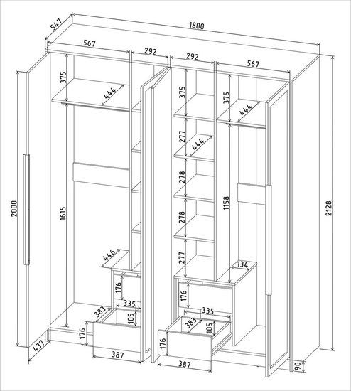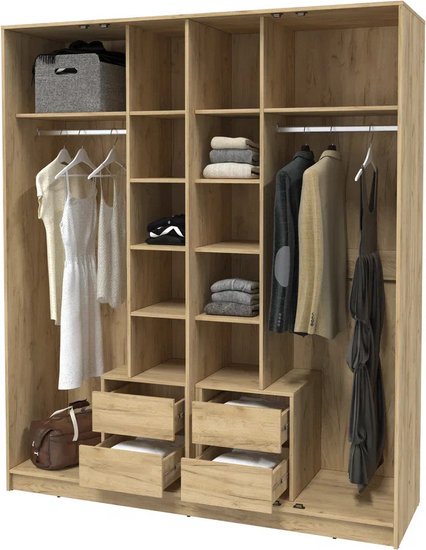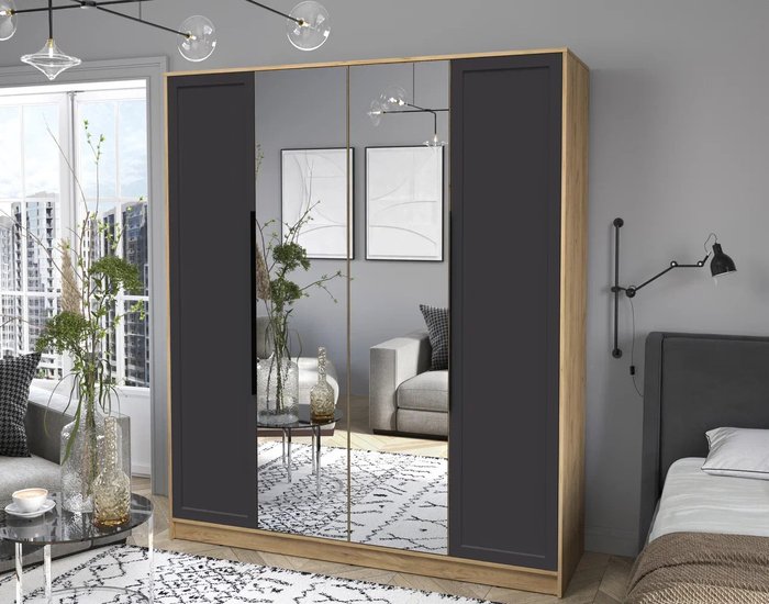 ✅Ключевые характеристикиРаспашной шкаф предназначен для хранения одежды и предметов общего назначения в жилой комнате или спальне. Модель имеет четыре двери и оснащена зеркалом; что расширяет функциональность и визуально увеличивает пространство. Размеры шкафа составляют 180 на 54.7 на 212.8 см; что обеспечивает вместительность и удобство использования.✅Преимущества и отличияШкаф выполнен из ЛМДФ с имитацией составного фасада; что придаёт изделию современный и стильный вид. Металлические ручки и чёрная фурнитура обеспечивают долговечность и удобство эксплуатации. Внутреннее наполнение включает десять полок; две штанги и четыре ящика; что позволяет рационально организовать хранение вещей.✅ПрактичностьМодель поставляется в разобранном виде; что облегчает транспортировку и сборку. Напольная установка и стандартное угловое окончание делают шкаф универсальным для различных планировок помещений. Наличие зеркала на фасаде добавляет функциональности без необходимости дополнительного оборудования.✅УникальностьДизайн с имитацией составного фасада и сочетание серого цвета с оттенками дерева средних тонов создают гармоничный и современный интерьерный акцент. Использование ЛМДФ в фасадах обеспечивает устойчивость к износу и лёгкость ухода; что выделяет этот шкаф среди аналогичных решений.✅Ключевые характеристикиРаспашной шкаф предназначен для хранения одежды и предметов общего назначения в жилой комнате или спальне. Модель имеет четыре двери и оснащена зеркалом; что расширяет функциональность и визуально увеличивает пространство. Размеры шкафа составляют 180 на 54.7 на 212.8 см; что обеспечивает вместительность и удобство использования.✅Преимущества и отличияШкаф выполнен из ЛМДФ с имитацией составного фасада; что придаёт изделию современный и стильный вид. Металлические ручки и чёрная фурнитура обеспечивают долговечность и удобство эксплуатации. Внутреннее наполнение включает десять полок; две штанги и четыре ящика; что позволяет рационально организовать хранение вещей.✅ПрактичностьМодель поставляется в разобранном виде; что облегчает транспортировку и сборку. Напольная установка и стандартное угловое окончание делают шкаф универсальным для различных планировок помещений. Наличие зеркала на фасаде добавляет функциональности без необходимости дополнительного оборудования.✅УникальностьДизайн с имитацией составного фасада и сочетание серого цвета с оттенками дерева средних тонов создают гармоничный и современный интерьерный акцент. Использование ЛМДФ в фасадах обеспечивает устойчивость к износу и лёгкость ухода; что выделяет этот шкаф среди аналогичных решений.