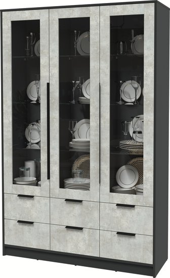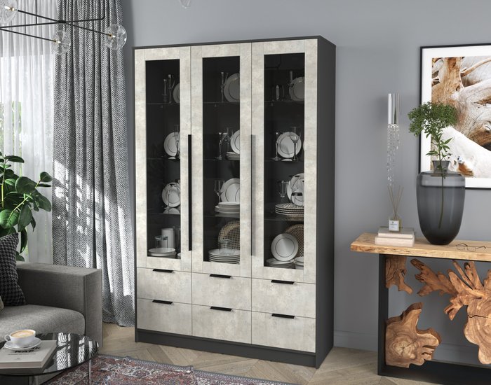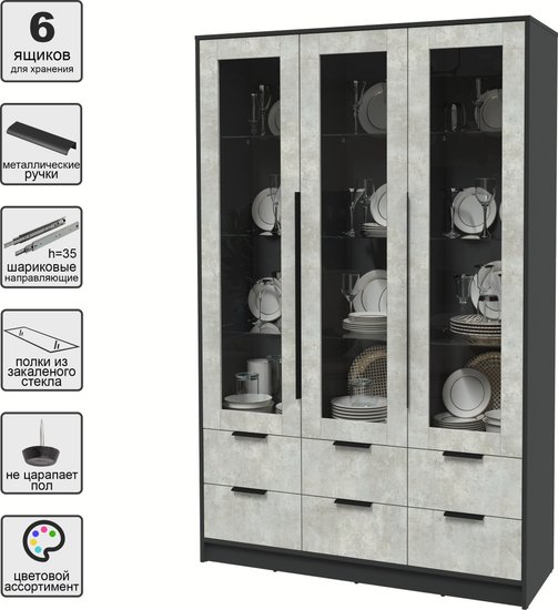 - ✅Ключевые характеристикиШкаф с витриной предназначен для хранения книг; посуды и различных предметов общего назначения в жилой комнате или столовой. Изготовлен из ЛДСП и стекла; что обеспечивает прочность и современный внешний вид. Размеры изделия составляют 136 на 45.1 на 212.6 см; что позволяет разместить его в помещениях с разной площадью.✅Преимущества и отличияМодель оснащена тремя распашными дверцами и шестью ящиками с шариковыми направляющими; что обеспечивает удобный доступ и надежность эксплуатации. Металлические ручки и черная фурнитура добавляют изделию стиль и долговечность. Каркас и фасад выполнены из качественных материалов; сочетающих ЛДСП и стекло; что придает шкафу современный и элегантный вид.✅ПрактичностьШкаф поставляется в разобранном виде; что облегчает транспортировку и сборку. Напольная установка и стандартное угловое окончание позволяют легко вписать изделие в интерьер. Наличие полок и ящиков обеспечивает удобное хранение различных предметов; а отсутствие подсветки не снижает функциональность при правильном освещении помещения.✅УникальностьДизайн с использованием сочетания серого цвета "бетон лайт" и черного антрацита создает стильный и современный образ. Использование шариковых направляющих для ящиков повышает комфорт эксплуатации и долговечность конструкции. Металлические ручки и стеклянные фасады подчеркивают высокое качество и внимание к деталям в этой модели. ✅Ключевые характеристикиШкаф с витриной предназначен для хранения книг; посуды и различных предметов общего назначения в жилой комнате или столовой. Изготовлен из ЛДСП и стекла; что обеспечивает прочность и современный внешний вид. Размеры изделия составляют 136 на 45.1 на 212.6 см; что позволяет разместить его в помещениях с разной площадью.✅Преимущества и отличияМодель оснащена тремя распашными дверцами и шестью ящиками с шариковыми направляющими; что обеспечивает удобный доступ и надежность эксплуатации. Металлические ручки и черная фурнитура добавляют изделию стиль и долговечность. Каркас и фасад выполнены из качественных материалов; сочетающих ЛДСП и стекло; что придает шкафу современный и элегантный вид.✅ПрактичностьШкаф поставляется в разобранном виде; что облегчает транспортировку и сборку. Напольная установка и стандартное угловое окончание позволяют легко вписать изделие в интерьер. Наличие полок и ящиков обеспечивает удобное хранение различных предметов; а отсутствие подсветки не снижает функциональность при правильном освещении помещения.✅УникальностьДизайн с использованием сочетания серого цвета "бетон лайт" и черного антрацита создает стильный и современный образ. Использование шариковых направляющих для ящиков повышает комфорт эксплуатации и долговечность конструкции. Металлические ручки и стеклянные фасады подчеркивают высокое качество и внимание к деталям в этой модели.