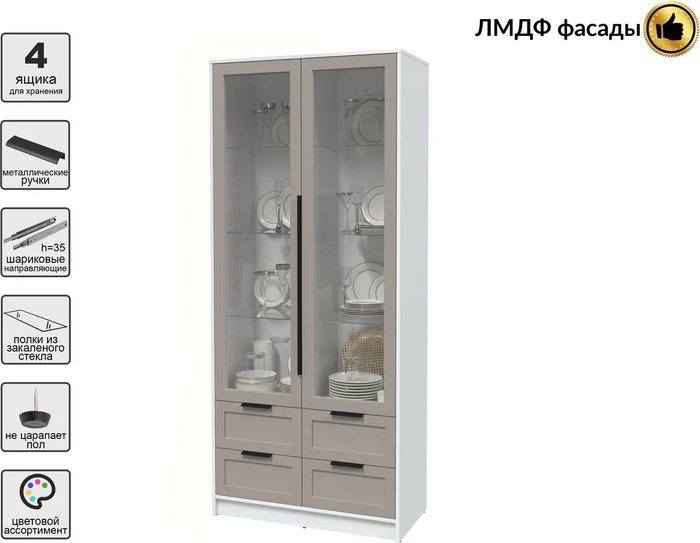 - ✅Ключевые характеристикиШкаф с витриной предназначен для хранения посуды и предметов общего назначения в жилой комнате или столовой. Модель выполнена в модульном формате; что позволяет интегрировать её в различные интерьерные решения. Общие габариты составляют 91.8 см в ширину; что обеспечивает вместительность при компактных размерах.✅Преимущества и отличияФасады изготовлены из ЛМДФ с декоративной фрезеровкой и стеклянными вставками; что придаёт изделию стильный и современный вид. Металлические ручки и чёрная фурнитура подчёркивают элегантность конструкции. Наличие четырёх ящиков с шариковыми направляющими обеспечивает удобство использования и долговечность.✅ПрактичностьВнутреннее наполнение включает шесть полок; которые позволяют рационально организовать пространство для хранения. Распашные двери обеспечивают лёгкий доступ к содержимому; а напольная установка упрощает монтаж и эксплуатацию. Модель поставляется в разобранном виде; что облегчает транспортировку.✅УникальностьДизайн с фрезеровкой и сочетание материалов ЛМДФ и стекла создают уникальный внешний вид; который выгодно выделяет изделие среди аналогов. Чёрная фурнитура и металлические ручки добавляют современный акцент; а модульная конструкция позволяет использовать шкаф как самостоятельный элемент или в составе системы мебели. ✅Ключевые характеристикиШкаф с витриной предназначен для хранения посуды и предметов общего назначения в жилой комнате или столовой. Модель выполнена в модульном формате; что позволяет интегрировать её в различные интерьерные решения. Общие габариты составляют 91.8 см в ширину; что обеспечивает вместительность при компактных размерах.✅Преимущества и отличияФасады изготовлены из ЛМДФ с декоративной фрезеровкой и стеклянными вставками; что придаёт изделию стильный и современный вид. Металлические ручки и чёрная фурнитура подчёркивают элегантность конструкции. Наличие четырёх ящиков с шариковыми направляющими обеспечивает удобство использования и долговечность.✅ПрактичностьВнутреннее наполнение включает шесть полок; которые позволяют рационально организовать пространство для хранения. Распашные двери обеспечивают лёгкий доступ к содержимому; а напольная установка упрощает монтаж и эксплуатацию. Модель поставляется в разобранном виде; что облегчает транспортировку.✅УникальностьДизайн с фрезеровкой и сочетание материалов ЛМДФ и стекла создают уникальный внешний вид; который выгодно выделяет изделие среди аналогов. Чёрная фурнитура и металлические ручки добавляют современный акцент; а модульная конструкция позволяет использовать шкаф как самостоятельный элемент или в составе системы мебели.