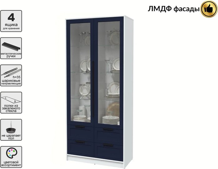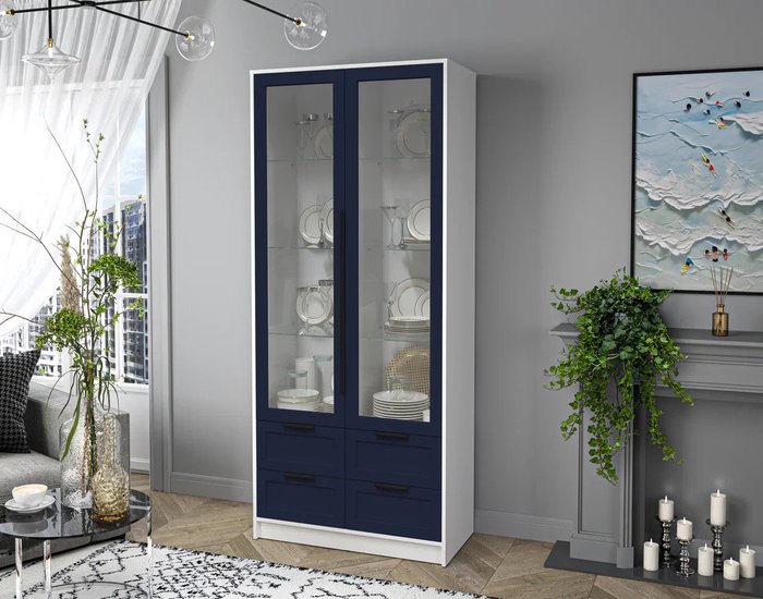 - ✅Ключевые характеристикиШкаф с витриной предназначен для хранения посуды и предметов общего назначения в жилой комнате или столовой. Модель выполнена в модульной конструкции с двумя распашными дверцами и четырьмя ящиками на шариковых направляющих. Высота изделия составляет 212.8 см; ширина 91.8 см; глубина 45.1 см; что обеспечивает вместительность при компактных размерах.✅Преимущества и отличияФасады из ЛМДФ и стекла с фрезеровкой придают шкафу стильный и современный вид; а металлические ручки и черная фурнитура обеспечивают надежность и долговечность. Наличие шести полок внутри шкафа позволяет удобно организовать пространство для хранения. Модель поставляется в разобранном виде; что облегчает транспортировку и сборку.✅ПрактичностьНапольная установка и стандартное угловое окончание делают шкаф универсальным для различных интерьеров. Отсутствие подсветки и зеркал упрощает уход и снижает стоимость. Четыре ящика с шариковыми направляющими обеспечивают плавное и удобное открывание; что важно для ежедневного использования.✅УникальностьДизайн с фрезеровкой и сочетание белого каркаса с синими фасадами в расцветке индиго выделяют изделие среди типичных шкафов с витриной. Использование модульной системы позволяет интегрировать шкаф в различные мебельные композиции; что расширяет возможности оформления интерьера. ✅Ключевые характеристикиШкаф с витриной предназначен для хранения посуды и предметов общего назначения в жилой комнате или столовой. Модель выполнена в модульной конструкции с двумя распашными дверцами и четырьмя ящиками на шариковых направляющих. Высота изделия составляет 212.8 см; ширина 91.8 см; глубина 45.1 см; что обеспечивает вместительность при компактных размерах.✅Преимущества и отличияФасады из ЛМДФ и стекла с фрезеровкой придают шкафу стильный и современный вид; а металлические ручки и черная фурнитура обеспечивают надежность и долговечность. Наличие шести полок внутри шкафа позволяет удобно организовать пространство для хранения. Модель поставляется в разобранном виде; что облегчает транспортировку и сборку.✅ПрактичностьНапольная установка и стандартное угловое окончание делают шкаф универсальным для различных интерьеров. Отсутствие подсветки и зеркал упрощает уход и снижает стоимость. Четыре ящика с шариковыми направляющими обеспечивают плавное и удобное открывание; что важно для ежедневного использования.✅УникальностьДизайн с фрезеровкой и сочетание белого каркаса с синими фасадами в расцветке индиго выделяют изделие среди типичных шкафов с витриной. Использование модульной системы позволяет интегрировать шкаф в различные мебельные композиции; что расширяет возможности оформления интерьера.