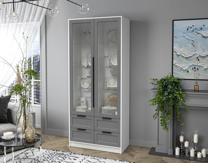 - ✅Ключевые характеристикиШкаф с витриной предназначен для хранения посуды и предметов общего назначения в жилой комнате или столовой. Модель выполнена в модульном формате с двумя распашными дверцами и четырьмя ящиками; оснащёнными шариковыми направляющими. Высота изделия составляет 212.8 см; ширина - 91.8 см; глубина - 45.1 см.✅Преимущества и отличияФасады изготовлены из ЛМДФ и стекла с фрезеровкой; что придаёт шкафу стильный и современный вид. Металлические ручки и чёрная фурнитура обеспечивают надёжность и долговечность. Наличие шести полок внутри шкафа позволяет удобно организовать пространство для хранения.✅ПрактичностьШкаф поставляется в разобранном виде и устанавливается на пол; что облегчает транспортировку и монтаж. Отсутствие подсветки и зеркал делает конструкцию лаконичной и универсальной для различных интерьеров. Модель не имеет углового окончания; что упрощает размещение в стандартных помещениях.✅УникальностьДизайн с фрезеровкой и сочетание белого каркаса с фасадами цвета дуб серый создают гармоничный и современный образ. Использование модульной системы позволяет интегрировать шкаф в различные мебельные композиции; расширяя возможности оформления жилого пространства. ✅Ключевые характеристикиШкаф с витриной предназначен для хранения посуды и предметов общего назначения в жилой комнате или столовой. Модель выполнена в модульном формате с двумя распашными дверцами и четырьмя ящиками; оснащёнными шариковыми направляющими. Высота изделия составляет 212.8 см; ширина - 91.8 см; глубина - 45.1 см.✅Преимущества и отличияФасады изготовлены из ЛМДФ и стекла с фрезеровкой; что придаёт шкафу стильный и современный вид. Металлические ручки и чёрная фурнитура обеспечивают надёжность и долговечность. Наличие шести полок внутри шкафа позволяет удобно организовать пространство для хранения.✅ПрактичностьШкаф поставляется в разобранном виде и устанавливается на пол; что облегчает транспортировку и монтаж. Отсутствие подсветки и зеркал делает конструкцию лаконичной и универсальной для различных интерьеров. Модель не имеет углового окончания; что упрощает размещение в стандартных помещениях.✅УникальностьДизайн с фрезеровкой и сочетание белого каркаса с фасадами цвета дуб серый создают гармоничный и современный образ. Использование модульной системы позволяет интегрировать шкаф в различные мебельные композиции; расширяя возможности оформления жилого пространства.