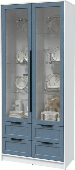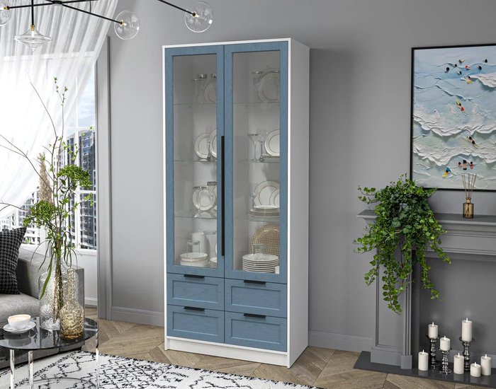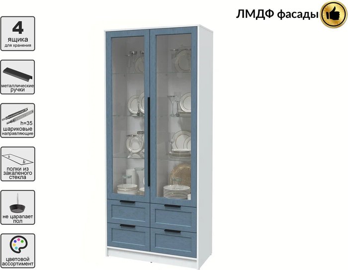 • ✅Ключевые характеристикиШкаф с витриной предназначен для хранения посуды и других предметов общего назначения в жилой комнате или столовой. Модель выполнена в модульной конструкции с двумя распашными дверцами и четырьмя ящиками; оснащёнными шариковыми направляющими. Высота изделия составляет 212.8 см; ширина 91.8 см; глубина 45.1 см.✅Преимущества и отличияФасады из ЛМДФ и стекла с фрезеровкой придают шкафу современный и стильный вид; а металлические ручки и чёрная фурнитура обеспечивают долговечность и удобство эксплуатации. Наличие шести полок внутри шкафа позволяет рационально организовать пространство для хранения.✅ПрактичностьШкаф поставляется в разобранном виде; что облегчает транспортировку и сборку. Напольная установка и стандартное угловое окончание делают его универсальным для различных интерьеров. Отсутствие подсветки и зеркал упрощает уход и снижает стоимость.✅УникальностьДизайн с использованием модульной системы и сочетание белого каркаса с синим фасадом в расцветке дуб лазурный создают эффектный контраст и подчёркивают индивидуальность мебели; что выгодно выделяет её среди типичных решений. ✅Ключевые характеристикиШкаф с витриной предназначен для хранения посуды и других предметов общего назначения в жилой комнате или столовой. Модель выполнена в модульной конструкции с двумя распашными дверцами и четырьмя ящиками; оснащёнными шариковыми направляющими. Высота изделия составляет 212.8 см; ширина 91.8 см; глубина 45.1 см.✅Преимущества и отличияФасады из ЛМДФ и стекла с фрезеровкой придают шкафу современный и стильный вид; а металлические ручки и чёрная фурнитура обеспечивают долговечность и удобство эксплуатации. Наличие шести полок внутри шкафа позволяет рационально организовать пространство для хранения.✅ПрактичностьШкаф поставляется в разобранном виде; что облегчает транспортировку и сборку. Напольная установка и стандартное угловое окончание делают его универсальным для различных интерьеров. Отсутствие подсветки и зеркал упрощает уход и снижает стоимость.✅УникальностьДизайн с использованием модульной системы и сочетание белого каркаса с синим фасадом в расцветке дуб лазурный создают эффектный контраст и подчёркивают индивидуальность мебели; что выгодно выделяет её среди типичных решений.