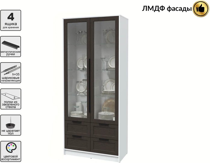 - ✅Ключевые характеристикиШкаф с витриной предназначен для хранения посуды и предметов общего назначения в жилой комнате или столовой. Модель выполнена в модульном формате с двумя распашными дверцами и четырьмя ящиками; оснащёнными шариковыми направляющими. Высота изделия составляет 212.8 см; ширина - 91.8 см; глубина - 45.1 см.✅Преимущества и отличияФасады из ЛМДФ и стекла с фрезеровкой придают шкафу стильный и современный вид; а металлические ручки и чёрная фурнитура обеспечивают надёжность и долговечность. Модель сочетает белый каркас с коричневым фасадом цвета дуб английский; что подчёркивает её универсальность и вписываемость в разные интерьеры.✅ПрактичностьОтсутствие откидных и раздвижных дверей упрощает использование; а наличие четырёх ящиков и шести полок позволяет удобно организовать пространство для хранения. Шариковые направляющие обеспечивают плавное и бесшумное открывание ящиков. Модель поставляется в разобранном виде и устанавливается на пол.✅УникальностьДизайн с фрезеровкой на фасадах и сочетание материалов ЛМДФ и стекла создают эффектный внешний вид; выделяющий шкаф среди типичных решений. Чёрная фурнитура и металлические ручки добавляют изделию современный акцент; а модульная конструкция позволяет интегрировать шкаф в систему мебели. ✅Ключевые характеристикиШкаф с витриной предназначен для хранения посуды и предметов общего назначения в жилой комнате или столовой. Модель выполнена в модульном формате с двумя распашными дверцами и четырьмя ящиками; оснащёнными шариковыми направляющими. Высота изделия составляет 212.8 см; ширина - 91.8 см; глубина - 45.1 см.✅Преимущества и отличияФасады из ЛМДФ и стекла с фрезеровкой придают шкафу стильный и современный вид; а металлические ручки и чёрная фурнитура обеспечивают надёжность и долговечность. Модель сочетает белый каркас с коричневым фасадом цвета дуб английский; что подчёркивает её универсальность и вписываемость в разные интерьеры.✅ПрактичностьОтсутствие откидных и раздвижных дверей упрощает использование; а наличие четырёх ящиков и шести полок позволяет удобно организовать пространство для хранения. Шариковые направляющие обеспечивают плавное и бесшумное открывание ящиков. Модель поставляется в разобранном виде и устанавливается на пол.✅УникальностьДизайн с фрезеровкой на фасадах и сочетание материалов ЛМДФ и стекла создают эффектный внешний вид; выделяющий шкаф среди типичных решений. Чёрная фурнитура и металлические ручки добавляют изделию современный акцент; а модульная конструкция позволяет интегрировать шкаф в систему мебели.