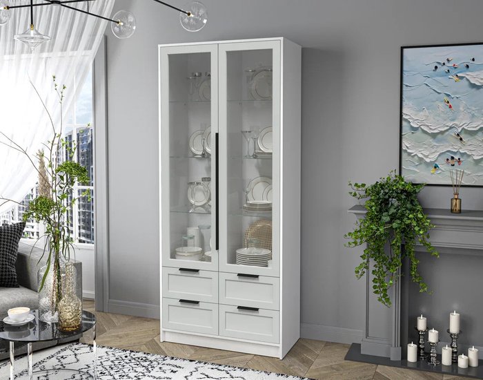 - ✅Ключевые характеристикиШкаф с витриной предназначен для хранения посуды и предметов общего назначения в жилой комнате или столовой. Модель выполнена в модульном формате; что позволяет интегрировать её в различные интерьерные решения. Размеры изделия составляют 91.8 см в ширину; что обеспечивает вместительность при компактных габаритах.✅Преимущества и отличияФасады из ЛМДФ и стекла с фрезеровкой придают шкафу современный и стильный вид; а металлические ручки и черная фурнитура обеспечивают надежность и долговечность. Наличие четырёх ящиков с шариковыми направляющими гарантирует плавное и удобное открывание; а шесть полок внутри шкафа позволяют рационально организовать пространство для хранения.✅ПрактичностьМодель поставляется в разобранном виде; что облегчает транспортировку и сборку. Напольная установка обеспечивает устойчивость и простоту размещения в помещении. Распашные двери удобны в использовании и обеспечивают полный доступ к содержимому шкафа без ограничений.✅УникальностьДизайн с фрезеровкой и сочетание серого фасада с белым каркасом создают эффектный контраст; который выделяет шкаф среди аналогичных решений. Использование модульной системы позволяет комбинировать шкаф с другими элементами коллекции; расширяя возможности оформления интерьера. ✅Ключевые характеристикиШкаф с витриной предназначен для хранения посуды и предметов общего назначения в жилой комнате или столовой. Модель выполнена в модульном формате; что позволяет интегрировать её в различные интерьерные решения. Размеры изделия составляют 91.8 см в ширину; что обеспечивает вместительность при компактных габаритах.✅Преимущества и отличияФасады из ЛМДФ и стекла с фрезеровкой придают шкафу современный и стильный вид; а металлические ручки и черная фурнитура обеспечивают надежность и долговечность. Наличие четырёх ящиков с шариковыми направляющими гарантирует плавное и удобное открывание; а шесть полок внутри шкафа позволяют рационально организовать пространство для хранения.✅ПрактичностьМодель поставляется в разобранном виде; что облегчает транспортировку и сборку. Напольная установка обеспечивает устойчивость и простоту размещения в помещении. Распашные двери удобны в использовании и обеспечивают полный доступ к содержимому шкафа без ограничений.✅УникальностьДизайн с фрезеровкой и сочетание серого фасада с белым каркасом создают эффектный контраст; который выделяет шкаф среди аналогичных решений. Использование модульной системы позволяет комбинировать шкаф с другими элементами коллекции; расширяя возможности оформления интерьера.