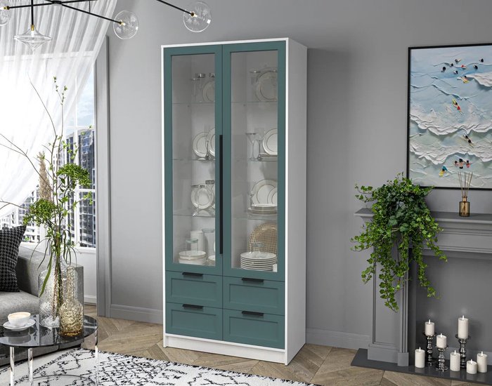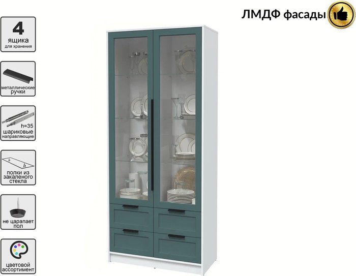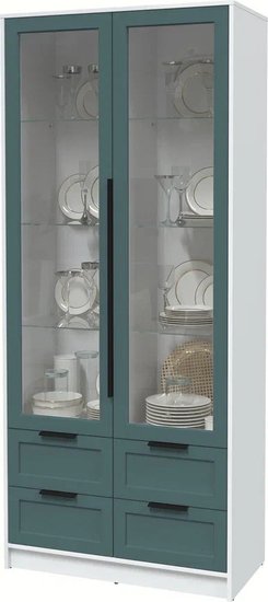 - ✅Ключевые характеристикиШкаф с витриной предназначен для хранения посуды и предметов общего назначения в жилой комнате или столовой. Его модульная конструкция позволяет легко интегрировать элемент в существующую мебельную систему. Общие габариты составляют 91.8 см в ширину; что обеспечивает вместительность при компактных размерах.✅Преимущества и отличияФасады выполнены из ЛМДФ и стекла с фрезеровкой; что придаёт изделию стильный и современный вид. Металлические ручки и шариковые направляющие ящиков обеспечивают долговечность и удобство эксплуатации. Наличие четырёх ящиков и шести полок позволяет рационально организовать пространство для хранения.✅ПрактичностьШкаф оснащён распашными дверцами; что облегчает доступ к содержимому. Напольная установка и стандартное угловое окончание делают его универсальным для различных интерьеров. Поставка в разобранном виде упрощает транспортировку и сборку.✅УникальностьДизайн с использованием фрезеровки и сочетание белого каркаса с зелёным фасадом в расцветке верде создают оригинальный и привлекательный внешний вид. Чёрная фурнитура добавляет контраст и подчёркивает стиль изделия; выделяя его среди типичных решений. ✅Ключевые характеристикиШкаф с витриной предназначен для хранения посуды и предметов общего назначения в жилой комнате или столовой. Его модульная конструкция позволяет легко интегрировать элемент в существующую мебельную систему. Общие габариты составляют 91.8 см в ширину; что обеспечивает вместительность при компактных размерах.✅Преимущества и отличияФасады выполнены из ЛМДФ и стекла с фрезеровкой; что придаёт изделию стильный и современный вид. Металлические ручки и шариковые направляющие ящиков обеспечивают долговечность и удобство эксплуатации. Наличие четырёх ящиков и шести полок позволяет рационально организовать пространство для хранения.✅ПрактичностьШкаф оснащён распашными дверцами; что облегчает доступ к содержимому. Напольная установка и стандартное угловое окончание делают его универсальным для различных интерьеров. Поставка в разобранном виде упрощает транспортировку и сборку.✅УникальностьДизайн с использованием фрезеровки и сочетание белого каркаса с зелёным фасадом в расцветке верде создают оригинальный и привлекательный внешний вид. Чёрная фурнитура добавляет контраст и подчёркивает стиль изделия; выделяя его среди типичных решений.