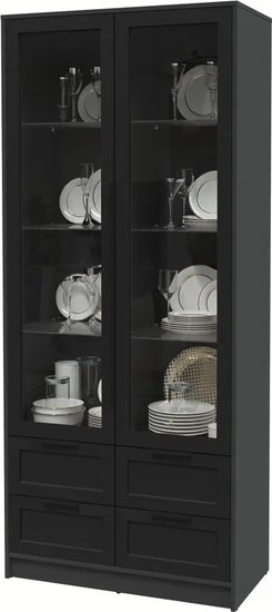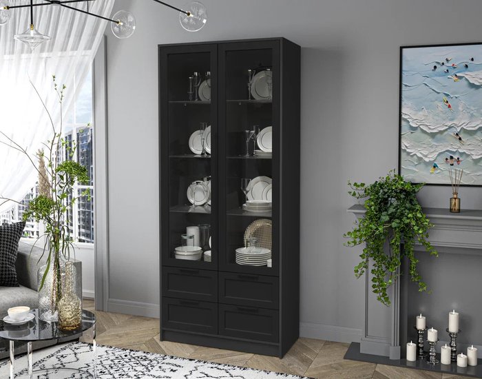 - ✅Ключевые характеристикиШкаф с витриной предназначен для хранения посуды и предметов общего назначения в жилой комнате или столовой. Модель выполнена в модульном формате; что позволяет интегрировать её в различные интерьерные решения. Габариты шкафа составляют 91.8 см в ширину; что обеспечивает вместительность при компактных размерах.✅Преимущества и отличияФасады изготовлены из ЛМДФ и стекла с фрезеровкой; что придаёт изделию современный и стильный вид. Металлические ручки и чёрная фурнитура подчёркивают лаконичность дизайна. Наличие четырёх ящиков с шариковыми направляющими обеспечивает удобство использования и долговечность конструкции.✅ПрактичностьШкаф оснащён двумя распашными дверцами и шестью полками внутри; что позволяет рационально организовать пространство для хранения. Модель поставляется в разобранном виде; что облегчает транспортировку и сборку. Напольная установка гарантирует устойчивость и надёжность.✅УникальностьДизайн с фрезеровкой и использование чёрного цвета в фасадах; каркасе и фурнитуре создают эффектный и современный образ мебели. Модель входит в коллекцию Концепт Тренд; что подчёркивает её актуальность и соответствие современным тенденциям в оформлении интерьеров. ✅Ключевые характеристикиШкаф с витриной предназначен для хранения посуды и предметов общего назначения в жилой комнате или столовой. Модель выполнена в модульном формате; что позволяет интегрировать её в различные интерьерные решения. Габариты шкафа составляют 91.8 см в ширину; что обеспечивает вместительность при компактных размерах.✅Преимущества и отличияФасады изготовлены из ЛМДФ и стекла с фрезеровкой; что придаёт изделию современный и стильный вид. Металлические ручки и чёрная фурнитура подчёркивают лаконичность дизайна. Наличие четырёх ящиков с шариковыми направляющими обеспечивает удобство использования и долговечность конструкции.✅ПрактичностьШкаф оснащён двумя распашными дверцами и шестью полками внутри; что позволяет рационально организовать пространство для хранения. Модель поставляется в разобранном виде; что облегчает транспортировку и сборку. Напольная установка гарантирует устойчивость и надёжность.✅УникальностьДизайн с фрезеровкой и использование чёрного цвета в фасадах; каркасе и фурнитуре создают эффектный и современный образ мебели. Модель входит в коллекцию Концепт Тренд; что подчёркивает её актуальность и соответствие современным тенденциям в оформлении интерьеров.