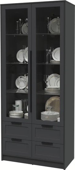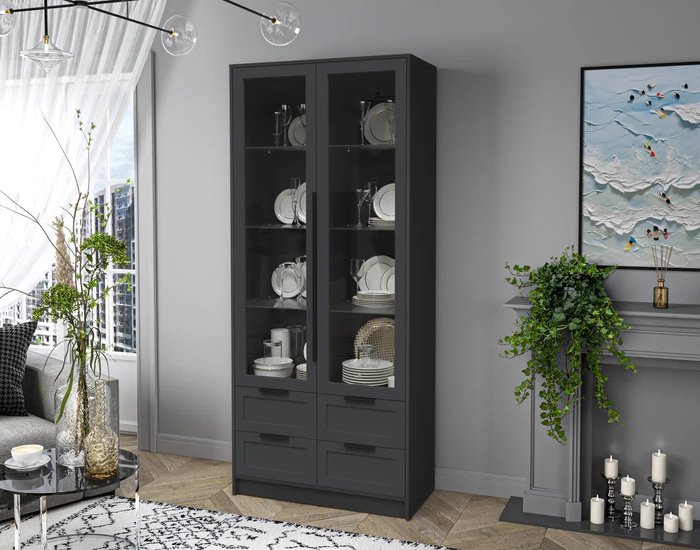 - ✅Ключевые характеристикиШкаф с витриной предназначен для хранения посуды и предметов общего назначения в жилой комнате или столовой. Модель выполнена в модульной конструкции с двумя распашными дверцами и четырьмя ящиками; оснащёнными шариковыми направляющими. Высота изделия составляет 212.8 см; ширина - 91.8 см; глубина - 45.1 см.✅Преимущества и отличияФасады из ЛМДФ и стекла с фрезеровкой придают шкафу современный и стильный вид; а металлические ручки обеспечивают долговечность и удобство использования. Черный каркас и фурнитура подчёркивают элегантность дизайна. Наличие шести полок внутри шкафа позволяет рационально организовать пространство для хранения.✅ПрактичностьШкаф поставляется в разобранном виде; что облегчает транспортировку и сборку. Напольная установка обеспечивает устойчивость конструкции. Отсутствие подсветки и зеркал делает изделие универсальным для различных интерьеров. Четыре вместительных ящика и шесть полок позволяют удобно разместить разнообразные предметы.✅УникальностьДизайн с фрезеровкой фасадов и сочетание материалов ЛМДФ и стекла выделяют шкаф среди аналогичных моделей. Использование шариковых направляющих в ящиках повышает комфорт эксплуатации и долговечность. Модель является частью коллекции Концепт Тренд; что гарантирует современный стиль и качество исполнения. ✅Ключевые характеристикиШкаф с витриной предназначен для хранения посуды и предметов общего назначения в жилой комнате или столовой. Модель выполнена в модульной конструкции с двумя распашными дверцами и четырьмя ящиками; оснащёнными шариковыми направляющими. Высота изделия составляет 212.8 см; ширина - 91.8 см; глубина - 45.1 см.✅Преимущества и отличияФасады из ЛМДФ и стекла с фрезеровкой придают шкафу современный и стильный вид; а металлические ручки обеспечивают долговечность и удобство использования. Черный каркас и фурнитура подчёркивают элегантность дизайна. Наличие шести полок внутри шкафа позволяет рационально организовать пространство для хранения.✅ПрактичностьШкаф поставляется в разобранном виде; что облегчает транспортировку и сборку. Напольная установка обеспечивает устойчивость конструкции. Отсутствие подсветки и зеркал делает изделие универсальным для различных интерьеров. Четыре вместительных ящика и шесть полок позволяют удобно разместить разнообразные предметы.✅УникальностьДизайн с фрезеровкой фасадов и сочетание материалов ЛМДФ и стекла выделяют шкаф среди аналогичных моделей. Использование шариковых направляющих в ящиках повышает комфорт эксплуатации и долговечность. Модель является частью коллекции Концепт Тренд; что гарантирует современный стиль и качество исполнения.