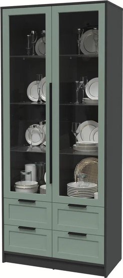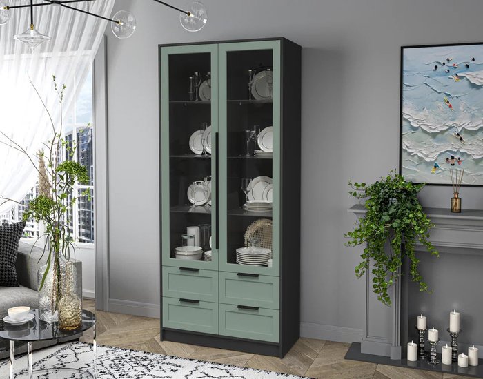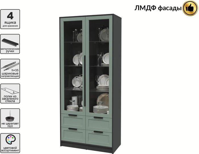 - ✅Ключевые характеристикиШкаф с витриной предназначен для хранения посуды и предметов общего назначения в жилой комнате или столовой. Модель выполнена в модульной конструкции с двумя распашными дверцами и четырьмя ящиками; дополненными шестью полками внутри. Высота изделия составляет 212.8 см; ширина - 91.8 см; глубина - 45.1 см.✅Преимущества и отличияФасады из ЛМДФ и стекла с фрезеровкой придают шкафу стильный и современный вид; а металлические ручки и черная фурнитура обеспечивают надежность и долговечность. Шариковые направляющие ящиков гарантируют плавное и бесшумное открывание; что повышает комфорт использования.✅ПрактичностьШкаф поставляется в разобранном виде; что облегчает транспортировку и сборку. Напольная установка позволяет легко разместить мебель в любом удобном месте комнаты. Отсутствие подсветки и зеркал делает конструкцию лаконичной и универсальной для различных интерьеров.✅УникальностьДизайн с фрезеровкой и сочетание цвета мята с черным каркасом создают оригинальный и свежий образ; выделяющий изделие среди типичных шкафов с витриной. Модульная система позволяет интегрировать шкаф в комплексное оформление помещения; обеспечивая гармоничный интерьер. ✅Ключевые характеристикиШкаф с витриной предназначен для хранения посуды и предметов общего назначения в жилой комнате или столовой. Модель выполнена в модульной конструкции с двумя распашными дверцами и четырьмя ящиками; дополненными шестью полками внутри. Высота изделия составляет 212.8 см; ширина - 91.8 см; глубина - 45.1 см.✅Преимущества и отличияФасады из ЛМДФ и стекла с фрезеровкой придают шкафу стильный и современный вид; а металлические ручки и черная фурнитура обеспечивают надежность и долговечность. Шариковые направляющие ящиков гарантируют плавное и бесшумное открывание; что повышает комфорт использования.✅ПрактичностьШкаф поставляется в разобранном виде; что облегчает транспортировку и сборку. Напольная установка позволяет легко разместить мебель в любом удобном месте комнаты. Отсутствие подсветки и зеркал делает конструкцию лаконичной и универсальной для различных интерьеров.✅УникальностьДизайн с фрезеровкой и сочетание цвета мята с черным каркасом создают оригинальный и свежий образ; выделяющий изделие среди типичных шкафов с витриной. Модульная система позволяет интегрировать шкаф в комплексное оформление помещения; обеспечивая гармоничный интерьер.