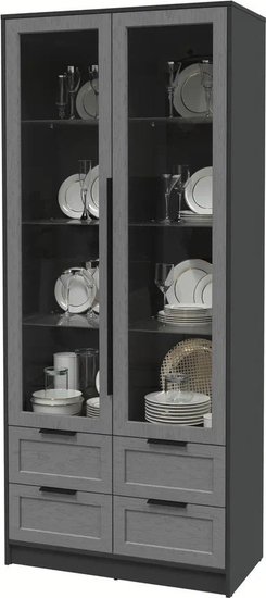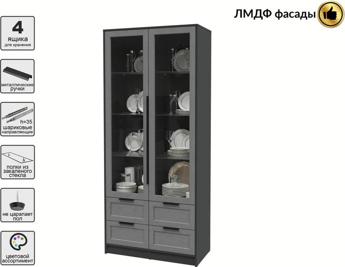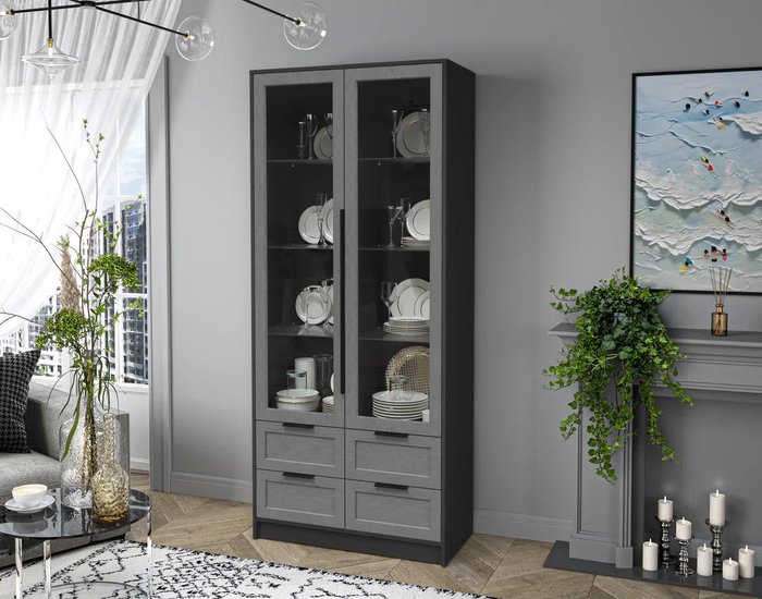 - ✅Ключевые характеристикиШкаф с витриной предназначен для хранения посуды и предметов общего назначения в жилой комнате или столовой. Модель выполнена в модульном формате; что позволяет интегрировать её в различные интерьерные решения. Размеры изделия составляют 91.8 см в ширину; что обеспечивает вместительность при компактных габаритах.✅Преимущества и отличияФасады изготовлены из ЛМДФ и стекла с фрезеровкой; что придаёт мебели современный и стильный вид. Металлические ручки и чёрная фурнитура подчёркивают лаконичность дизайна и обеспечивают долговечность. Наличие четырёх ящиков с шариковыми направляющими гарантирует плавное и удобное открывание.✅ПрактичностьВнутреннее наполнение включает шесть полок; которые позволяют рационально организовать пространство для хранения. Распашные дверцы обеспечивают лёгкий доступ к содержимому; а напольная установка упрощает монтаж и эксплуатацию. Модель поставляется в разобранном виде; что облегчает транспортировку.✅УникальностьДизайн с фрезеровкой и сочетание материалов ЛМДФ и стекла создают эффектный внешний вид; выделяющий шкаф среди аналогичных решений. Чёрный каркас и фурнитура гармонично сочетаются с оттенком дуба серого; что придаёт мебели современный и элегантный стиль. ✅Ключевые характеристикиШкаф с витриной предназначен для хранения посуды и предметов общего назначения в жилой комнате или столовой. Модель выполнена в модульном формате; что позволяет интегрировать её в различные интерьерные решения. Размеры изделия составляют 91.8 см в ширину; что обеспечивает вместительность при компактных габаритах.✅Преимущества и отличияФасады изготовлены из ЛМДФ и стекла с фрезеровкой; что придаёт мебели современный и стильный вид. Металлические ручки и чёрная фурнитура подчёркивают лаконичность дизайна и обеспечивают долговечность. Наличие четырёх ящиков с шариковыми направляющими гарантирует плавное и удобное открывание.✅ПрактичностьВнутреннее наполнение включает шесть полок; которые позволяют рационально организовать пространство для хранения. Распашные дверцы обеспечивают лёгкий доступ к содержимому; а напольная установка упрощает монтаж и эксплуатацию. Модель поставляется в разобранном виде; что облегчает транспортировку.✅УникальностьДизайн с фрезеровкой и сочетание материалов ЛМДФ и стекла создают эффектный внешний вид; выделяющий шкаф среди аналогичных решений. Чёрный каркас и фурнитура гармонично сочетаются с оттенком дуба серого; что придаёт мебели современный и элегантный стиль.